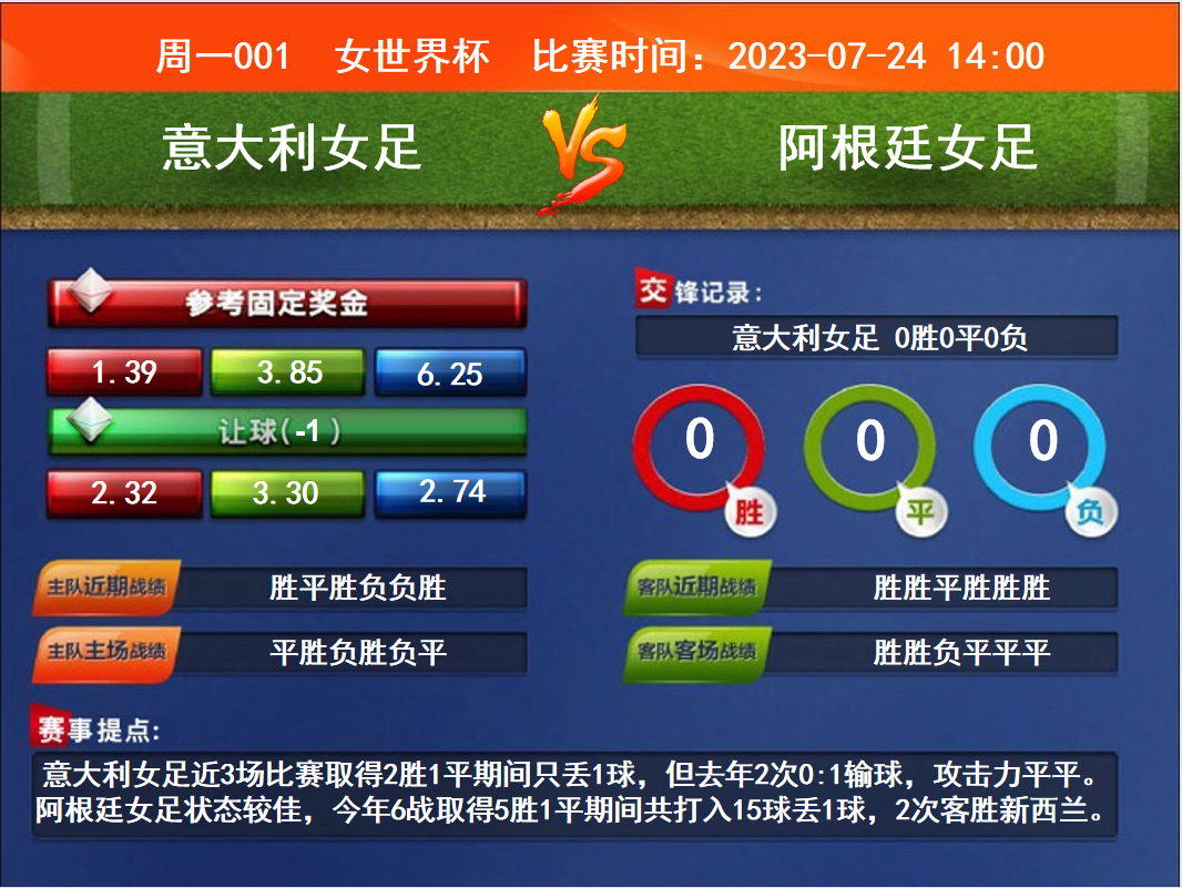比赛时间:2023-07-24 14:00赛事提点:意大利女足近3场比赛取得2胜1平期间只丢1球,但去年2次0:1输球,攻击力平平。阿根廷女足状态较佳,今年6战取得5胜1平期间共打入15球丢1球,2次客胜新西兰。
