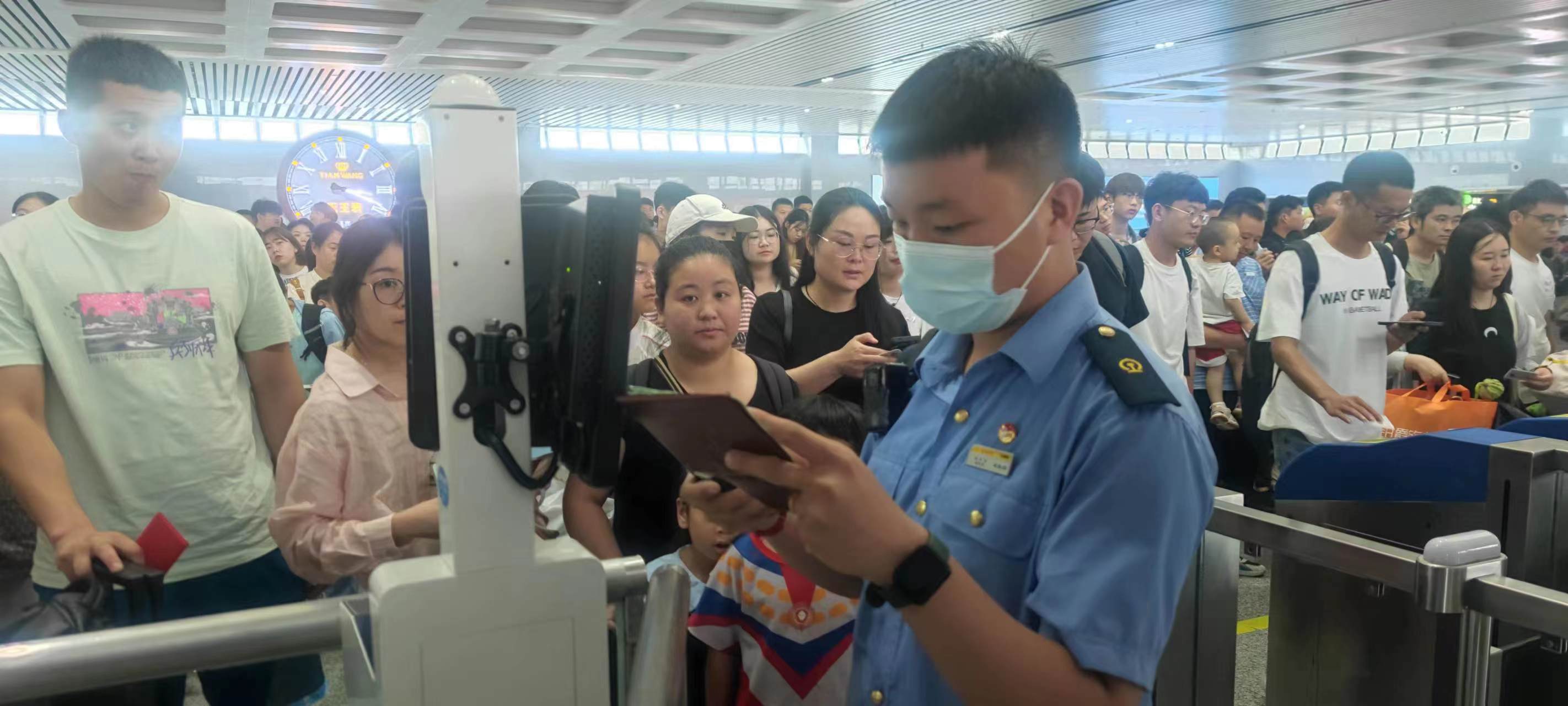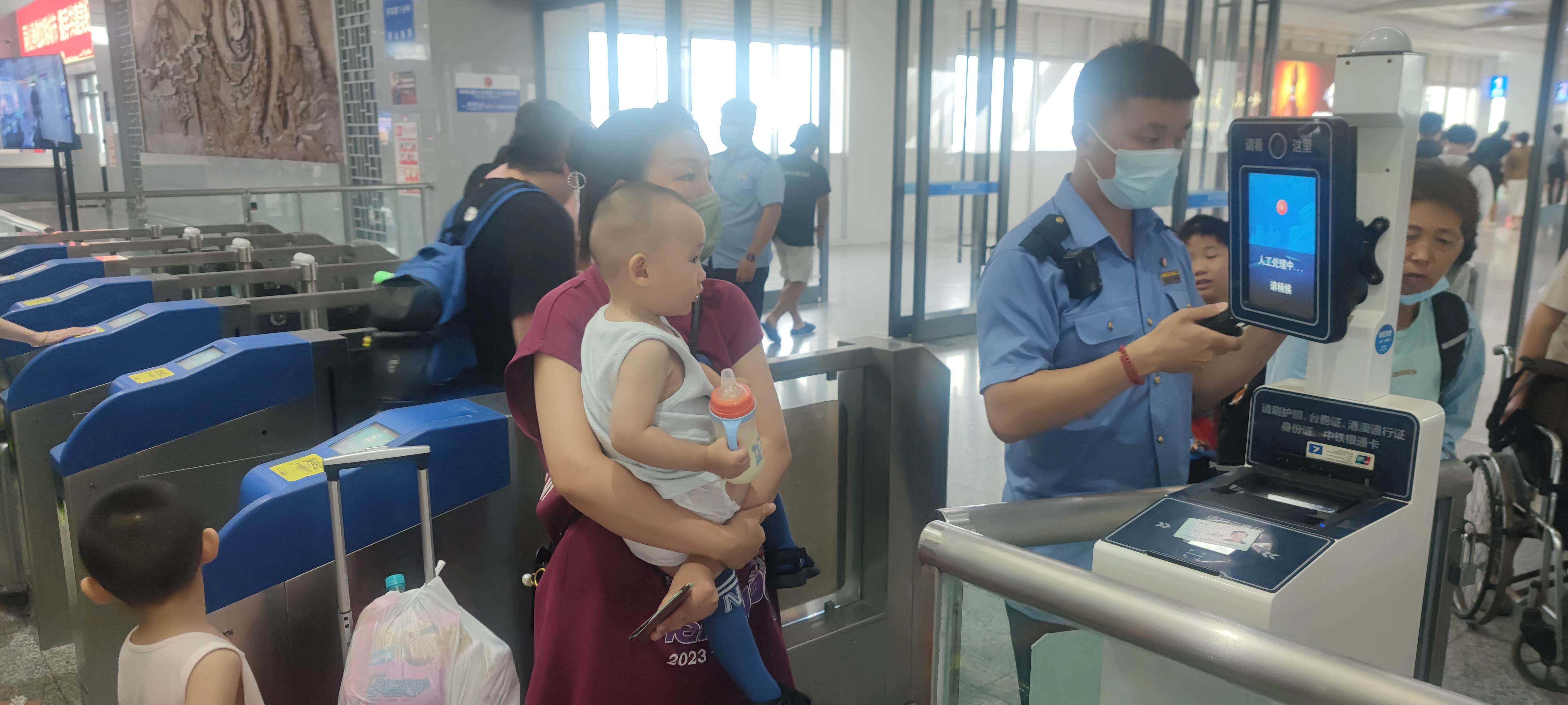 据周口东站相关负责人介绍,暑期以来,周口东站客流量不断增长,日均发送旅客达9200人次。新规实施以后,家长们带孩子出行时要携带好孩子的户口本、身份证等有效证件,有身份证的孩子可以自助刷闸机验票检票进站,携带户口簿、社保卡等证件的孩子则跟在家长身边走人工检票通道。“如果家长忘记携带儿童有效身份证件,可以申领临时的乘车身份证明。需要注意的是,没有申领过身份证的未成年人,则不能再办理临时身份证明。”周口东站相关负责人说,他们将切实保障儿童旅客乘车权益,将人文关怀体现到购票、进站、候车、乘车等全流程和各环节。②15