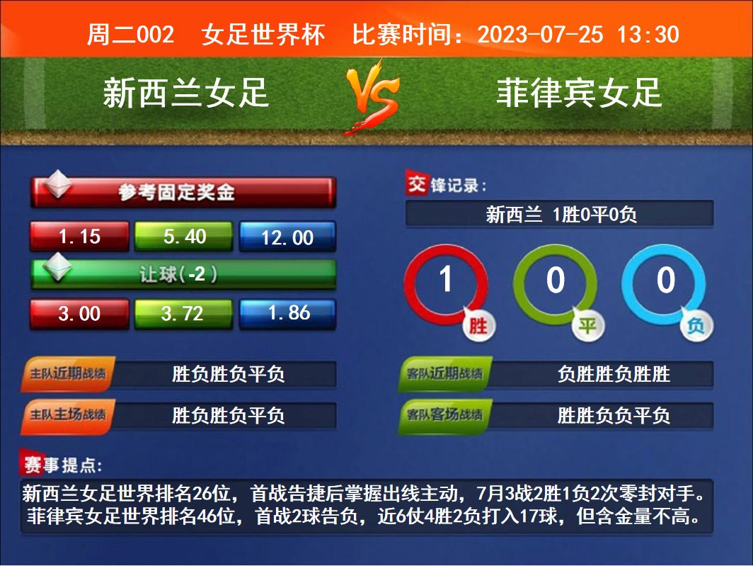 比赛时间:2023-07-25 13:30赛事提点:新西兰女足世界排名26位,首战告捷后掌握出线主动,7月3战2胜1负2次零封对手。菲律宾女足世界排名46位,首战2球告负,近6仗4胜2负打入17球,但含金量不高。