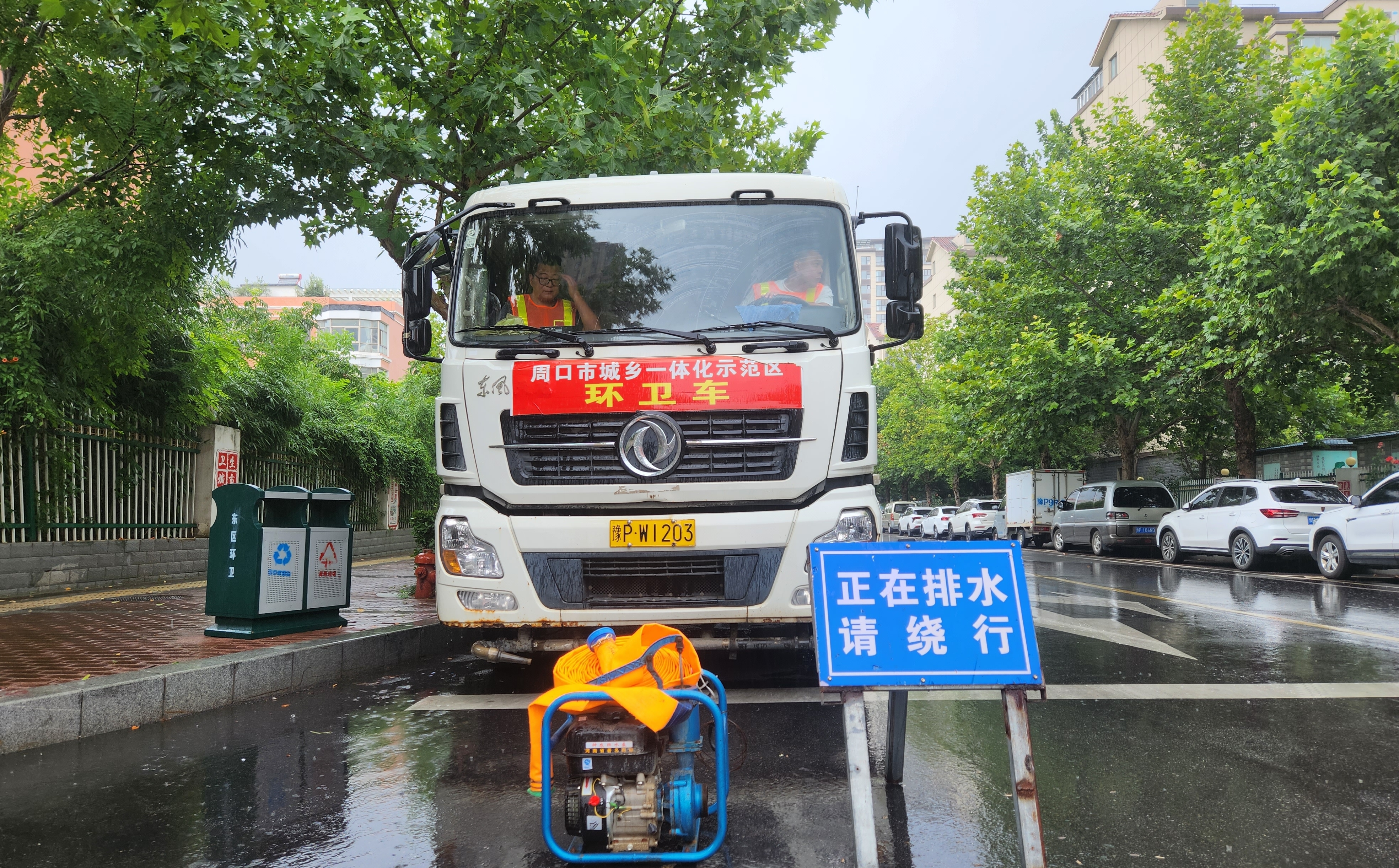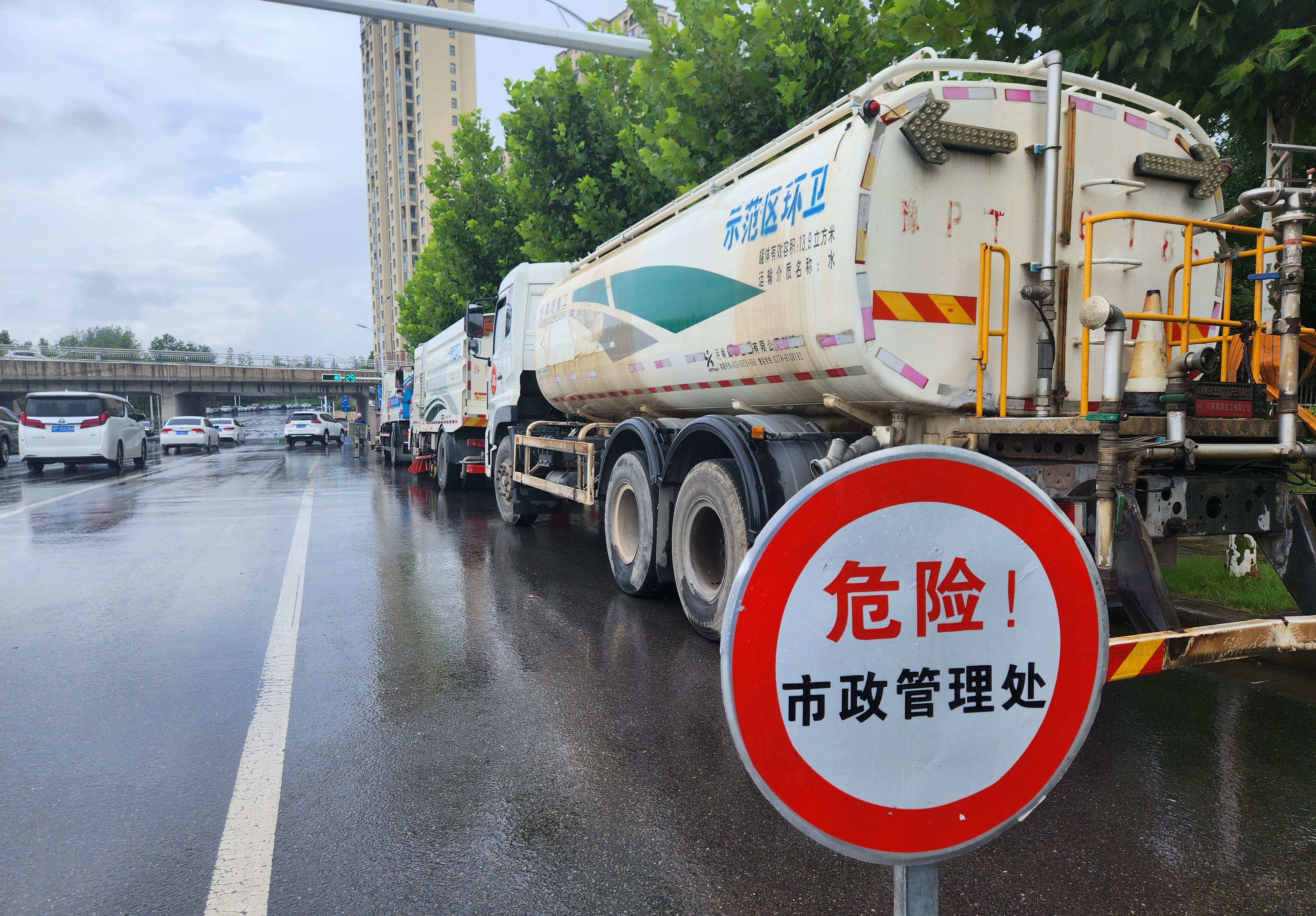 7月28日晚6时,示范区综合执法中心全员值守走上一线,第一时间启动应急预案,全面进入防汛应急状态。在府苑街、光明路、腾飞路、中原路桥下等几个易积水点位,记者看到提前预置的强排车组和防汛物资,路边设置的“危险”“正在排水”等警示标志格外醒目,应急“冲锋队”24小时值守,时刻保持迎应急状态。