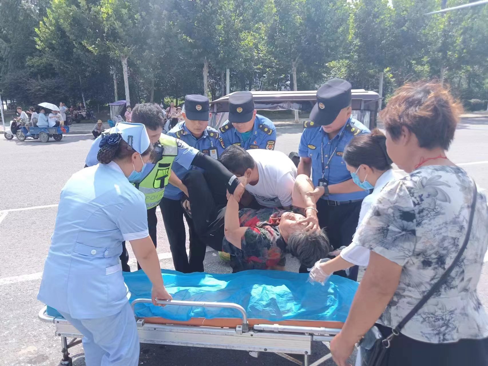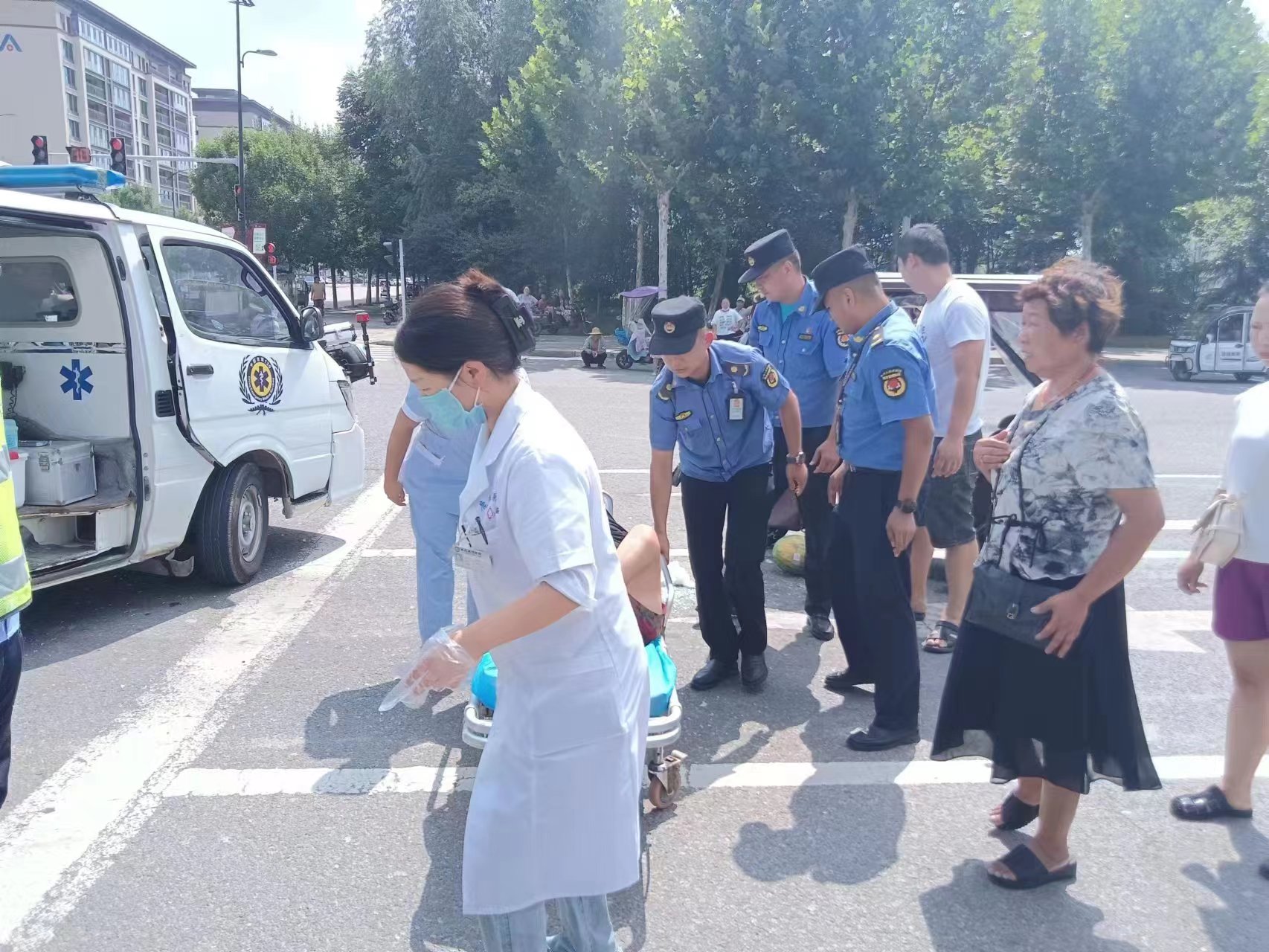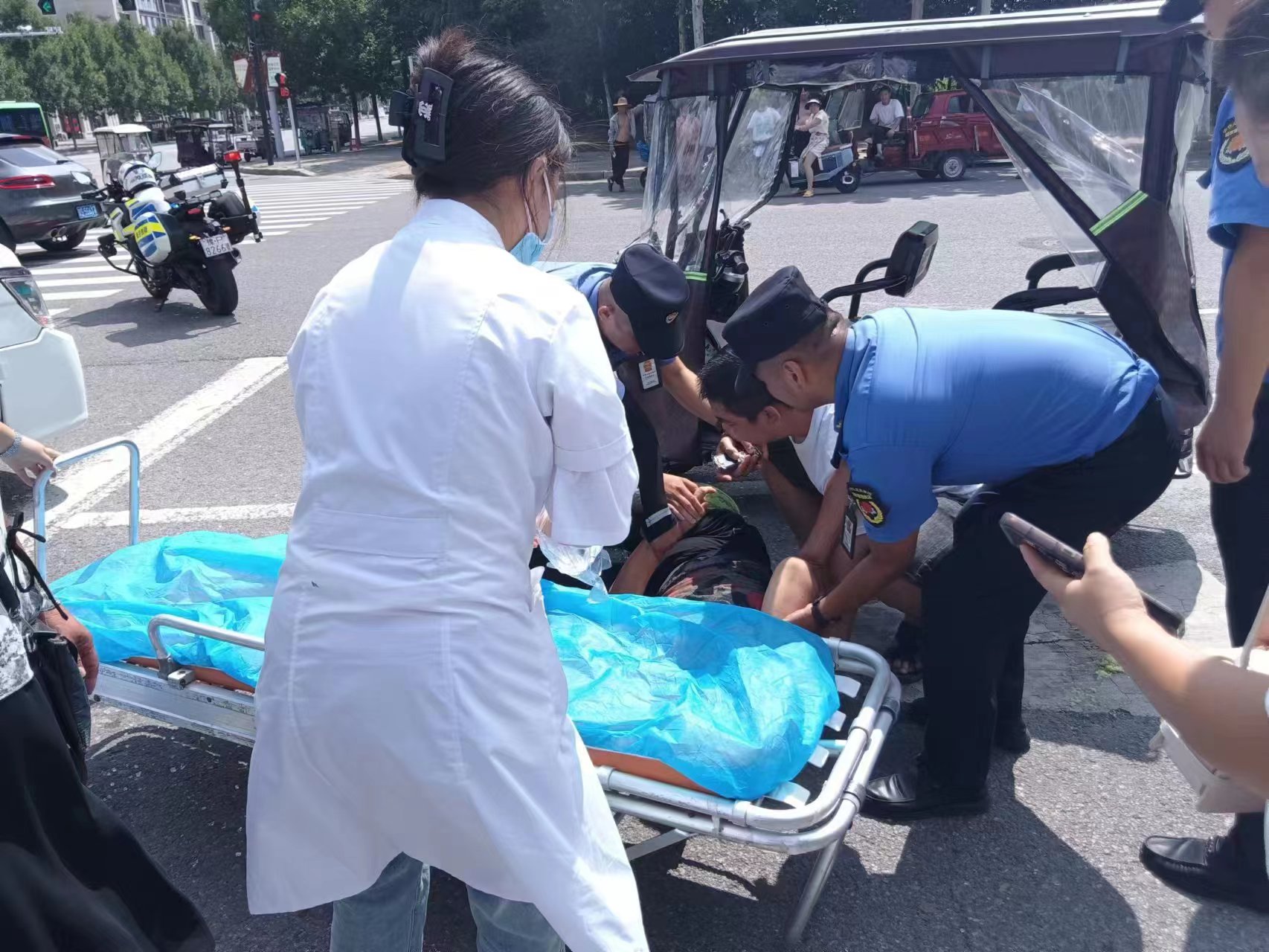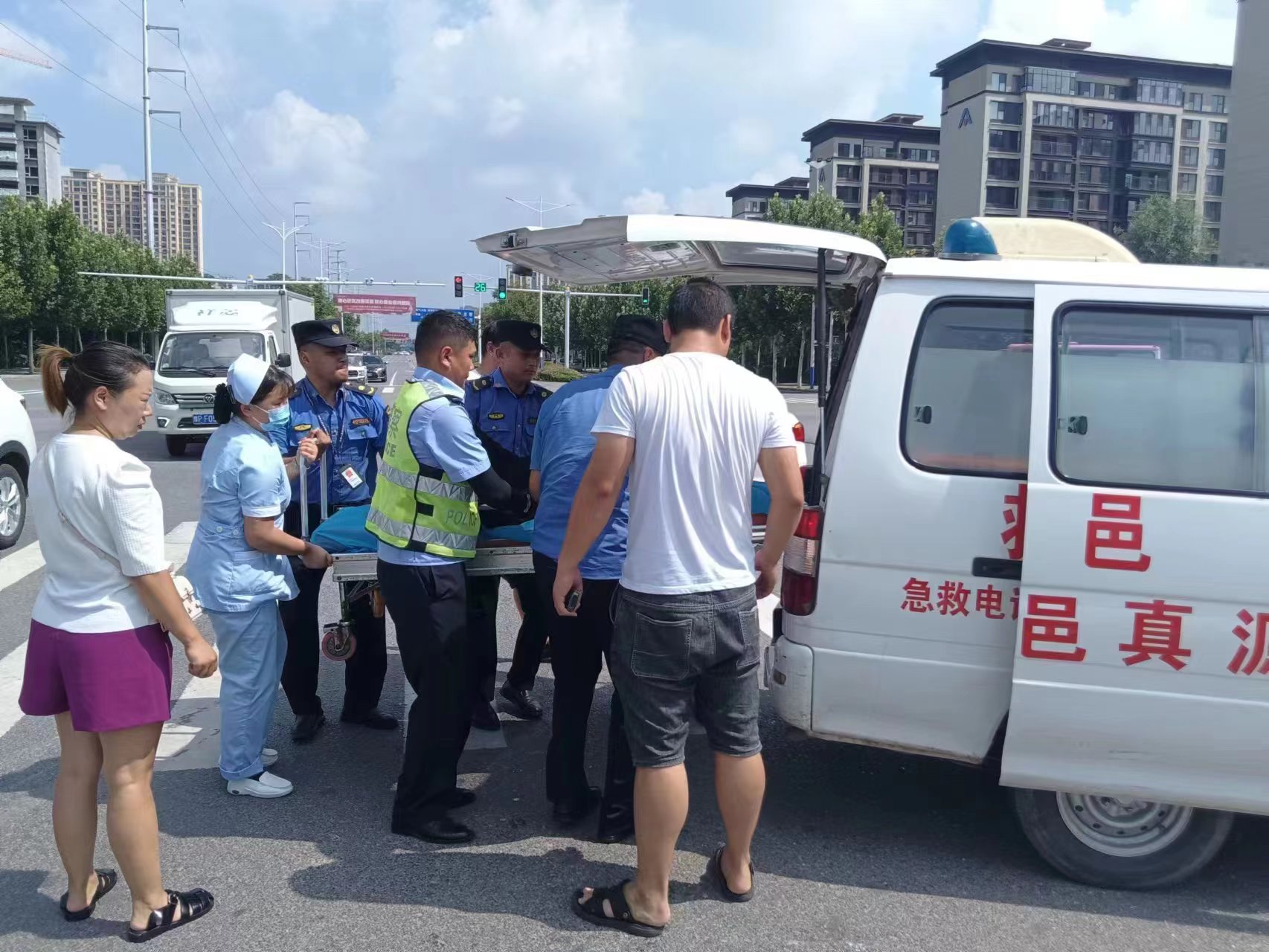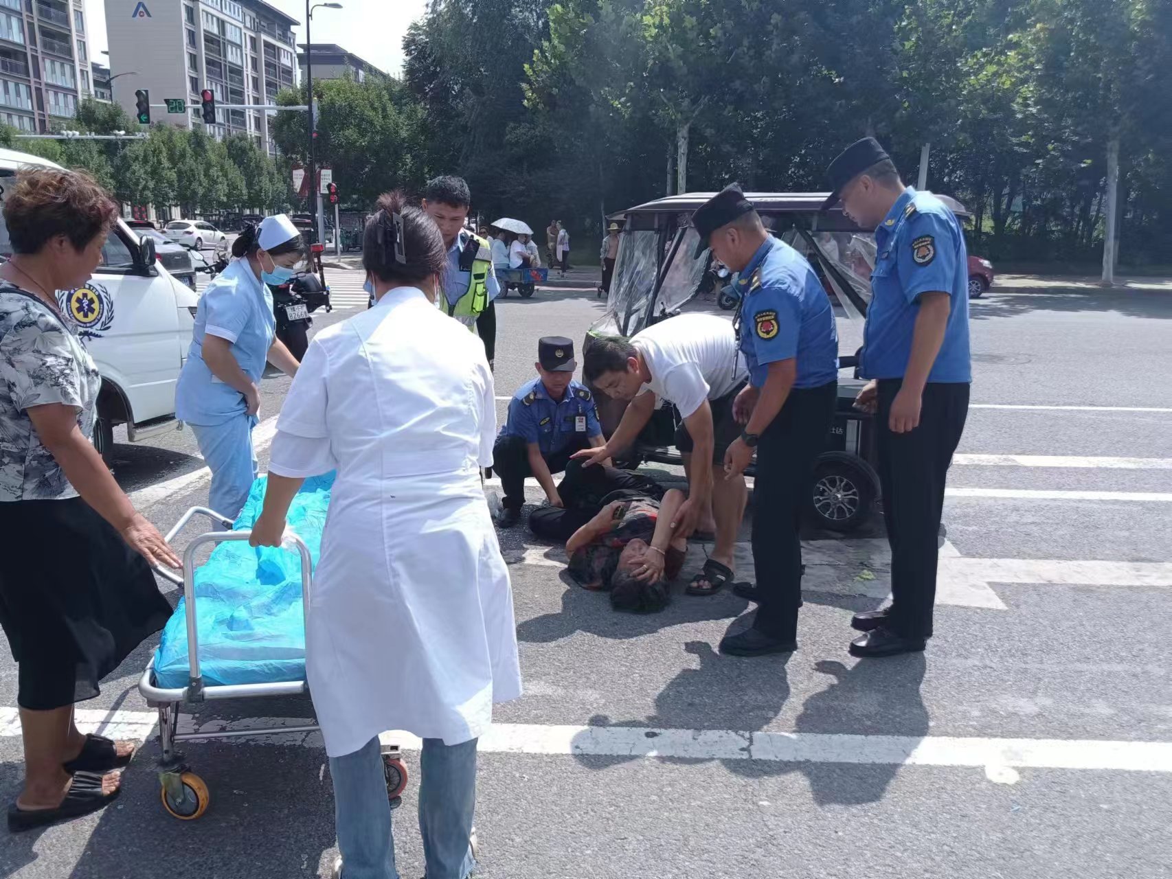 8月3日上午10时许,鹿邑县城西关仁让街与宋河大道交叉口发现一起交通事故,一位骑电动三轮车的老年女性被一辆轿车撞倒后,躺在炙热的柏油路面上并被三轮车压着。正在执勤的城管队员牛翔、吕传亚、李佳朋、寇学东发现后,立即前往施救,并拨打120急救电话和110报警电话,联系受伤老人家属。由于天气炎热,城管队员合力将三轮车抬开,为老人遮阳防止中暑。等110、120赶到后,城管队员又协助医务人员将老人抬上车,老人家属对城管队员及时施救的善举表示感谢。
