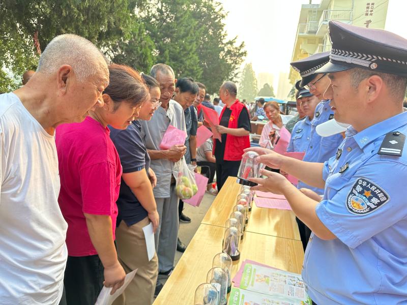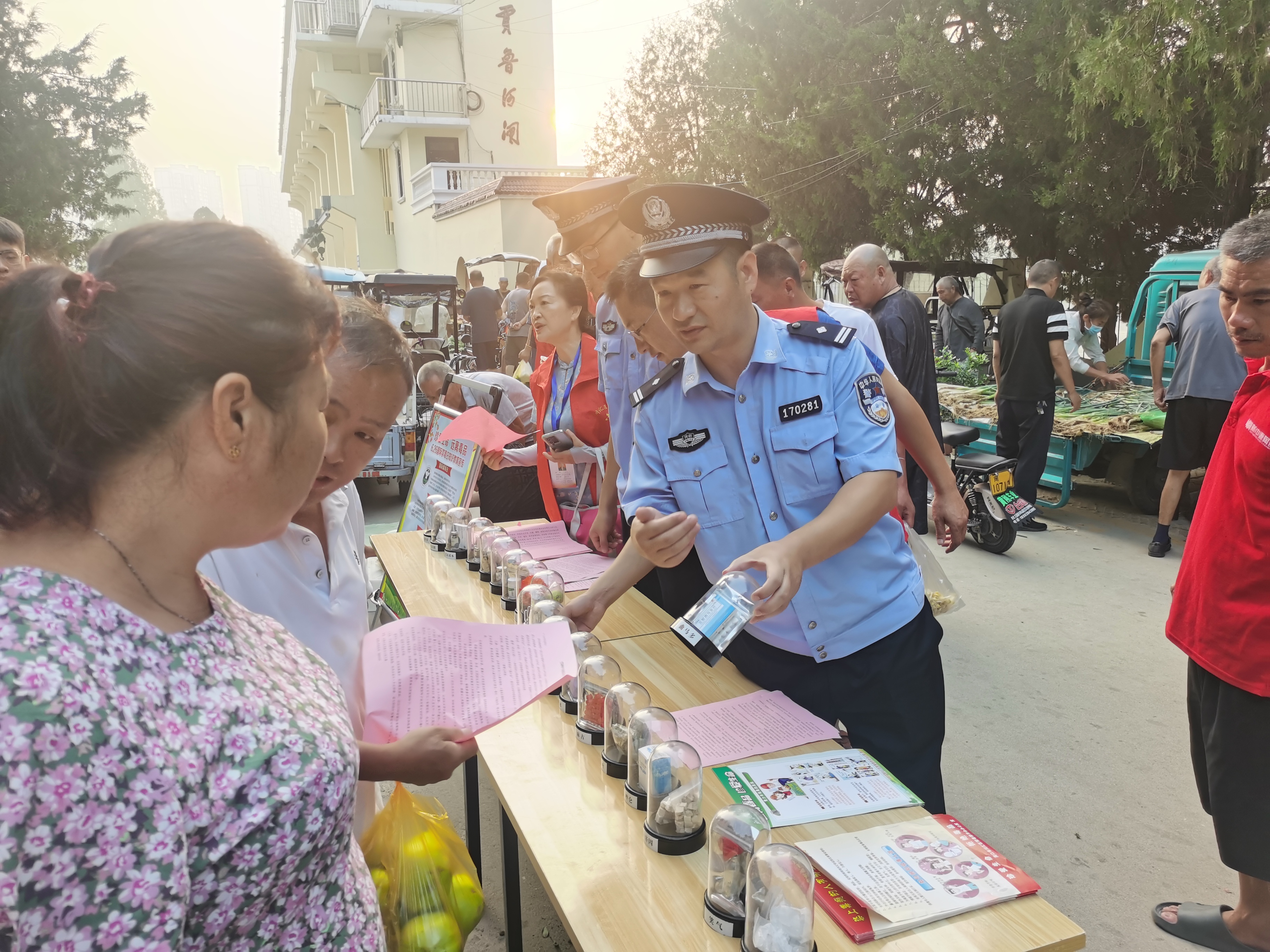 “阿姨您看,这就是易制毒植物毒株标本……”“大叔,这是我们的宣传单,带一份看看……”8月10日早晨,在摆满“瓶瓶罐罐”的桌子旁,着装整齐的民警忙活着“兜售产品”,市民或驻足聆听,或主动领取宣传单。