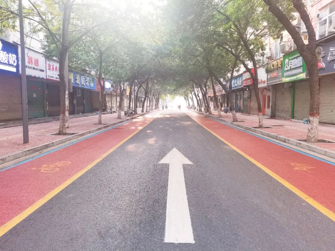 据了解,鹿邑县仙台路地处县城中心区域,长690米,宽9米,沿街两侧商铺多以美食为主,被大家称为“小吃街”,是鹿邑人逛街打卡的首选之地。因街道两旁的白蜡树枝繁叶茂,人行走在其间,头顶绿荫,微风习习,丝丝凉意扑面而来,又被称为“空调街”。不久前,该县城管部门在前期调研基础上,积极听取居民群众意见,精心进行勘察、设计,集中人力、物力资源,增加设备投入,从8月7日开始加班加点施工,至8月10日下午,整条路路面铺油达6210平方米,完成了道路提升工作,而后又采用红、黄、蓝三色对交通标线进行重新划设喷涂,将路段小吃街打造成了光彩夺目的“彩虹路”。