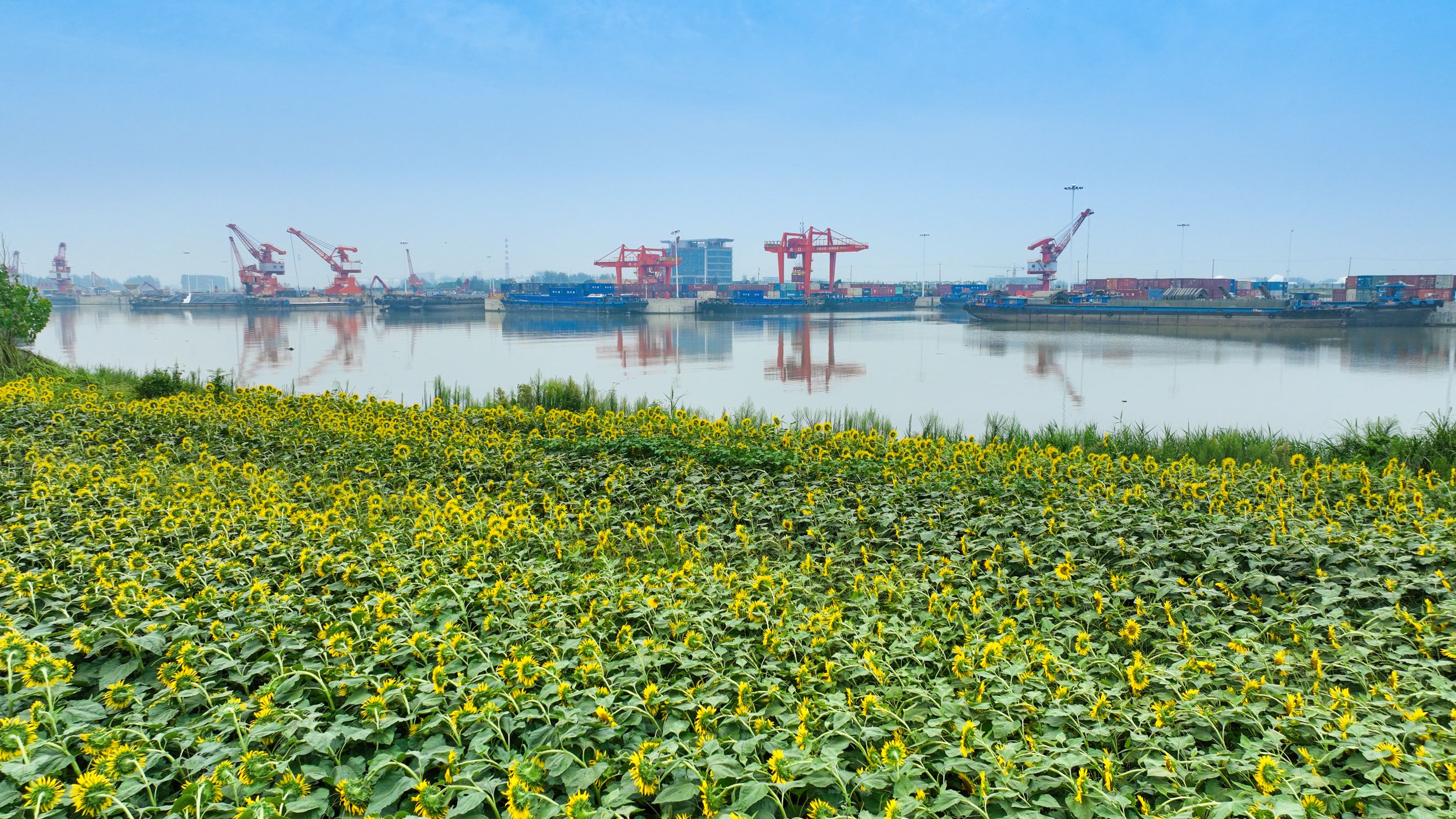 经过武盛大道桥后沿着沙颍河北岸道路一路向东,大约10分钟车程就来到可以观赏油葵花海的田庄行政村附近。站在路边向南望去,河水碧绿,灿烂绽放的油葵花铺满河畔、洒满田间,像一条金色绸缎镶嵌在蓝天碧水间,花海中飞舞的蜜蜂、蝴蝶显得野趣十足、生机盎然,河对岸周口港内船只来回穿梭。花海、流水、港口、船只描绘出希望和收获的幸福画卷。“我是在朋友圈里看到的油葵花海,正好赶到周末就带着孩子过来游玩,拍照、观赏都挺不错的。”市民李女士说。