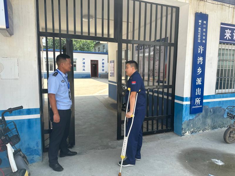 在火灾隐患培训现场,在发生火情的一线,在为新录消防员政审的路上……周口市消防救援支队城乡一体化示范区消防救援大队大队长杨振凯带伤不下“火线”,拄着拐杖,铆足干劲,坚守在工作岗位。近日,记者去采访时,他正拄着双拐到市公安局出入境管理支队和辖区派出所为新录用的消防员办理政审手续。