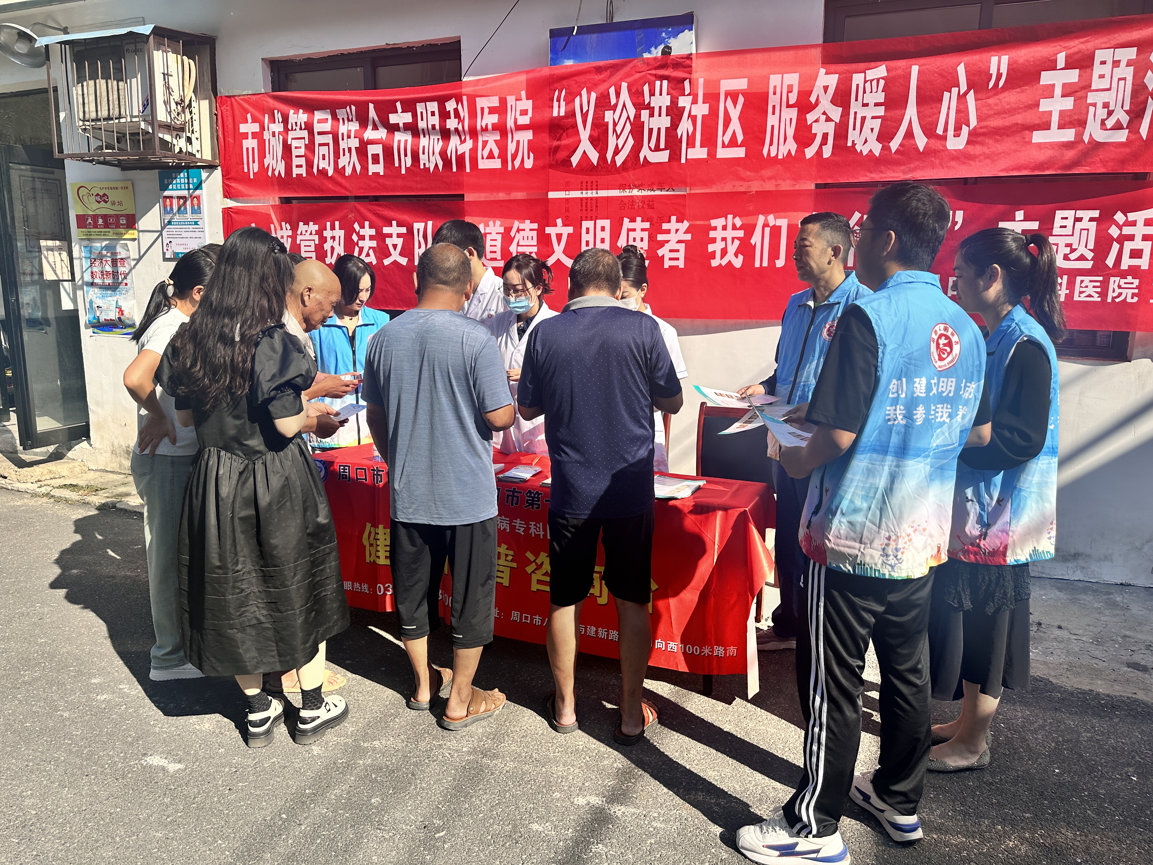 自中心城区“入户大走访”活动启动以来,市城管局着眼群众需求,紧盯“惠民利民”中心工作,大力开展丰富多彩的文明实践活动,“点亮”群众幸福生活。8月29日上午,该局组织“道德文明使者”和党员志愿者联合周口眼科医院医务人员,走进川汇区荷花路街道荷花社区开展“‘义诊进社区 服务暖人心’——道德文明使者进社区”主题活动,为社区群众提供视力检查、验光、眼底检查等服务,以实际行动展现“道德文明使者”风采。