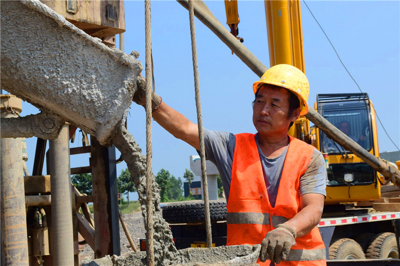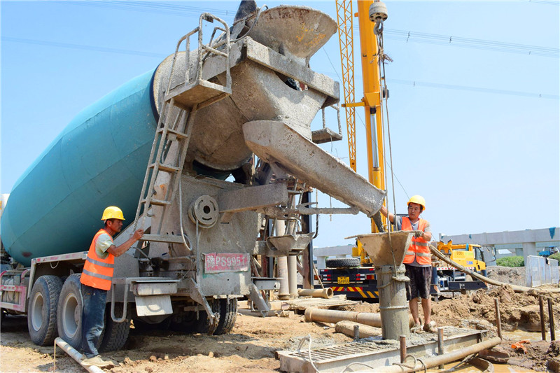 工人们正在用混凝土浇筑桥墩