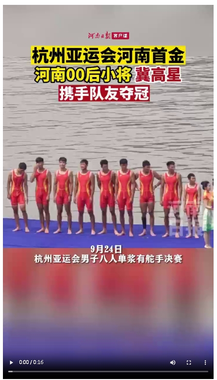 9月24日,杭州亚运会赛艇项目男子八人单桨有舵手的决赛在富阳水上运动中心落下帷幕。代表中国参赛的河南00后小将冀高星与队友齐心协力,最终以5分40秒17的成绩夺得冠军,这也是河南选手在本届亚运会上获得的第一枚金牌。