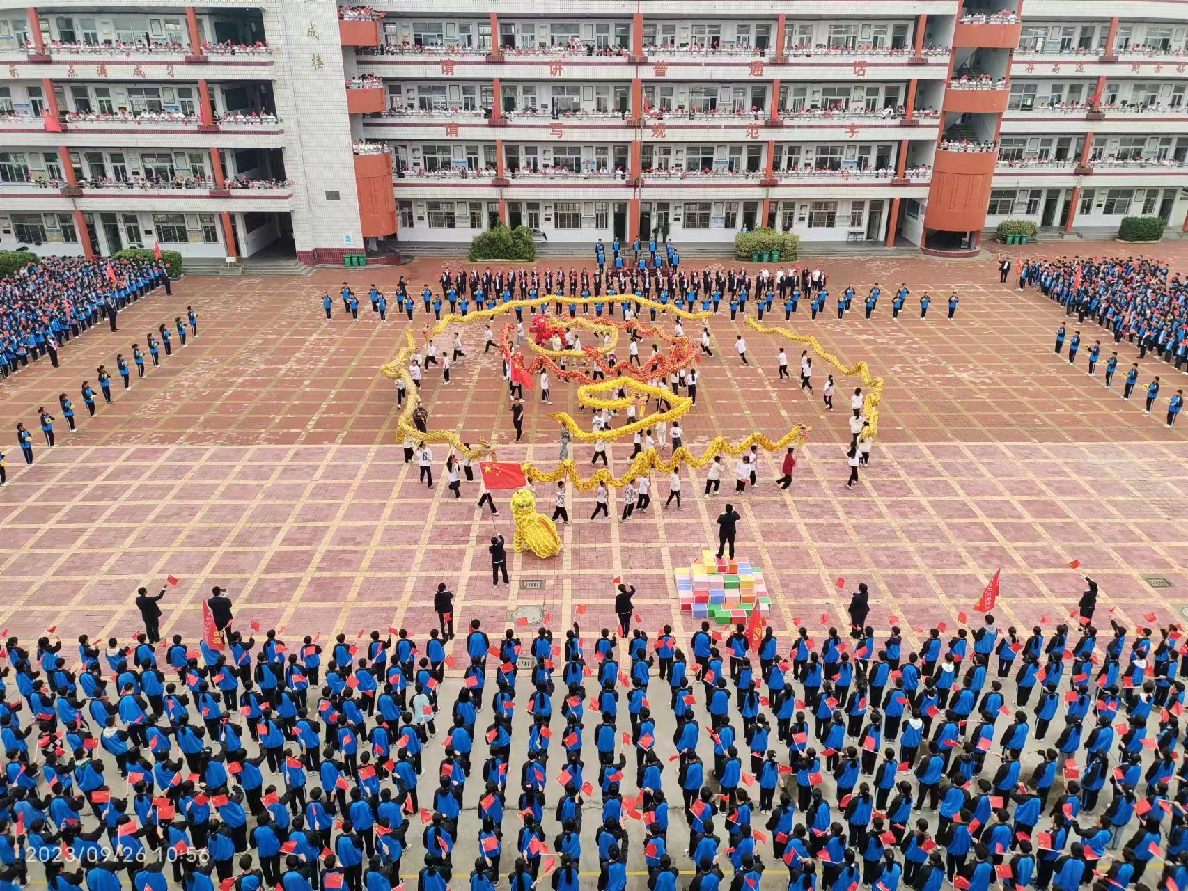 在师生们《歌唱祖国》的合唱中,在70多名舞蹈学员的伴舞下,实验中学13支舞龙队100多名舞龙队员排着整齐的队伍、迈着矫健的步伐、喊着洪亮的口号隆重登场。