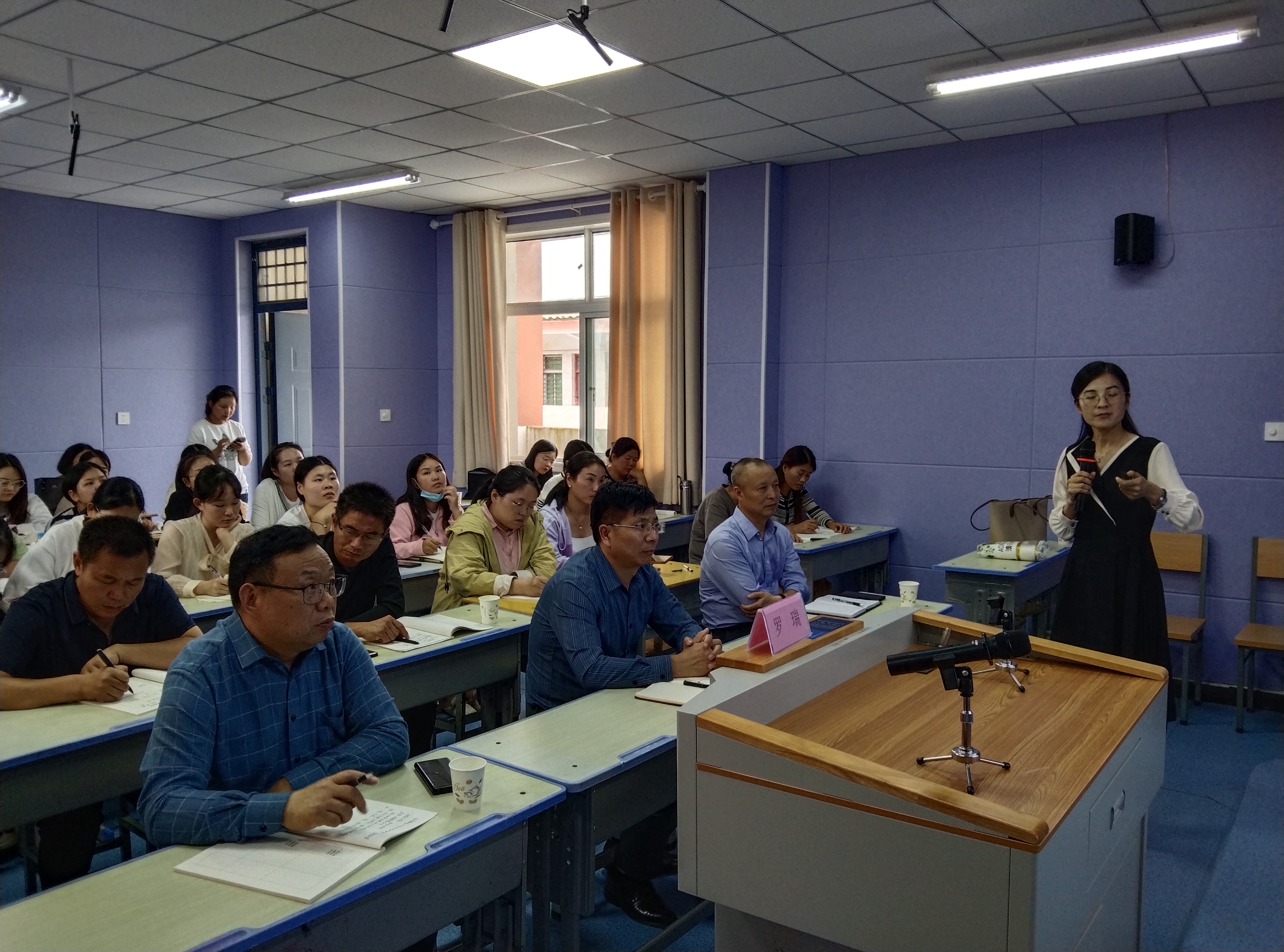 罗瑞,副教授,现任周口师范学院外国语学院课程与教学论教研室主任,系河南省优秀教师,河南省教学标兵,周口市优秀青年社科专家,周口市社科先进工作者,周口市优秀教师,周口师范学院学术技术带头人,曾荣获河南省本科高校教师课堂教学创新大赛特等奖第一名,河南省教育系统教学技能竞赛一等奖,周口师范学院教师课堂教学大赛一等奖,周口市社会科学优秀成果一等奖等多项荣誉。当日,罗瑞以《守正创新 潜心育人》为题,以深厚的理论功底,结合国家政策,联系教学实际,深入浅出地讲解了教育的意义、教师职业行为准则以及教育面临的新形势、新任务等内容,激励广大教师甘守三尺讲台,争做“四有”教师,同时自觉增强立德树人、教书育人的荣誉感和责任感,学为人师,行为世范,做学生健康成长的指导者和引路人,引起大家的强烈共鸣。