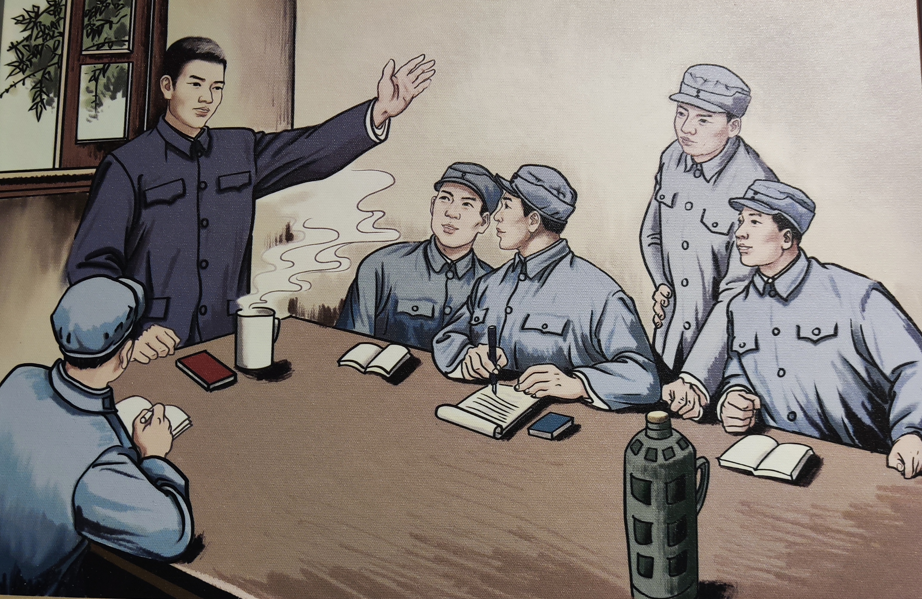 《拂晓报》记者采访西华县长、中共特别党员楚博。(《拂晓报》报史馆美术作品)