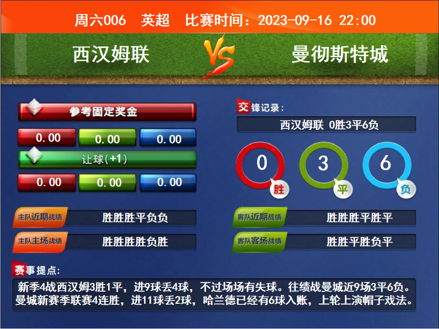 比赛时间:2023-09-16 22:00赛事提点:新季4战西汉姆3胜1平,进9球丢4球,不过场场有失球。往绩战曼城近9场3平6负。曼城新赛季联赛4连胜,进11球丢2球,哈兰德已经有6球入账,上轮上演帽子戏法。