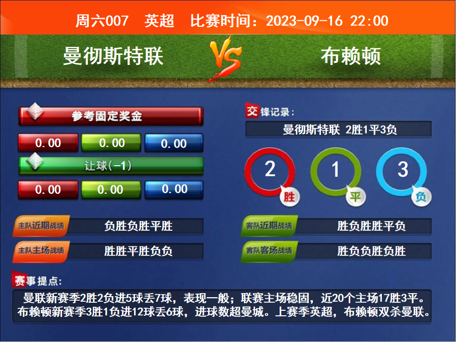 比赛时间:2023-09-16 22:00赛事提点:曼联新赛季2胜2负进5球丢7球,表现一般;联赛主场稳固,近20个主场17胜3平。布赖顿新赛季3胜1负进12球丢6球,进球数超曼城。上赛季英超,布赖顿双杀曼联。