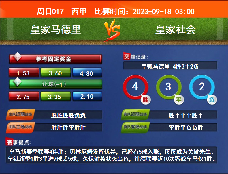 比赛时间:2023-09-18 03:00赛事提点:皇马新赛季联赛4连胜;贝林厄姆发挥优异,已经有5球入账,屡屡成为关键先生。皇社新季1胜3平进7球丢5球,久保健英状态出色,往绩联赛近10次客战皇马仅1胜。