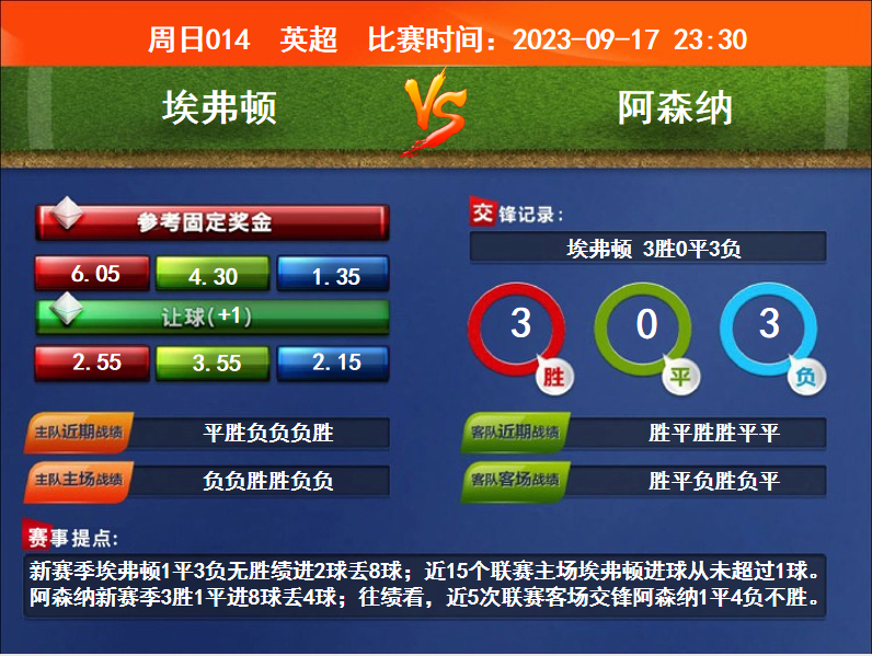 比赛时间:2023-09-17 23:30赛事提点:新赛季埃弗顿1平3负无胜绩进2球丢8球;近15个联赛主场埃弗顿进球从未超过1球。阿森纳新赛季3胜1平进8球丢4球;往绩看,近5次联赛客场交锋阿森纳1平4负不胜。