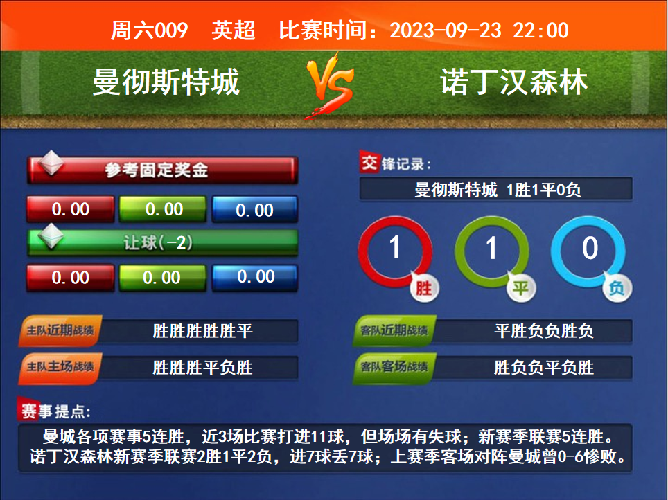 比赛时间:2023-09-23 22:00赛事提点:曼城各项赛事5连胜,近3场比赛打进11球,但场场有失球;新赛季联赛5连胜。诺丁汉森林新赛季联赛2胜1平2负,进7球丢7球;上赛季客场对阵曼城曾0-6惨败。