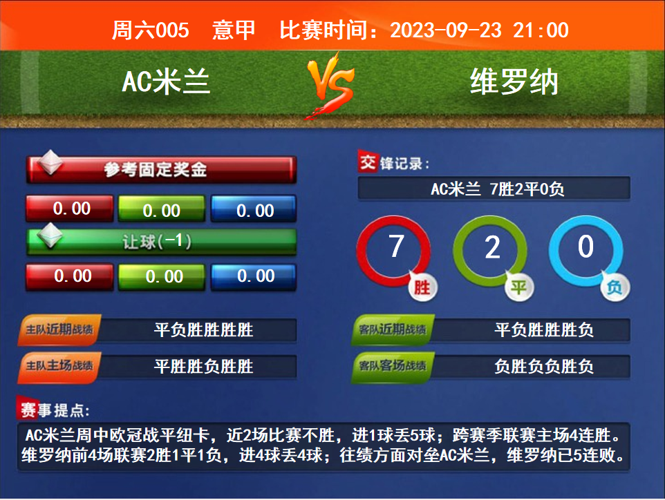 比赛时间:2023-09-23 21:00赛事提点:AC米兰周中欧冠战平纽卡,近2场比赛不胜,进1球丢5球;跨赛季联赛主场4连胜。维罗纳前4场联赛2胜1平1负,进4球丢4球;往绩方面对垒AC米兰,维罗纳已5连败。