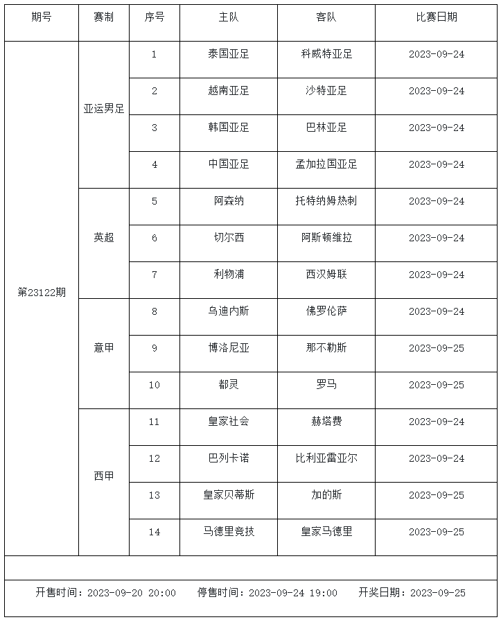 足球彩票胜负游戏(14场和任选9场)第23122期赛程: