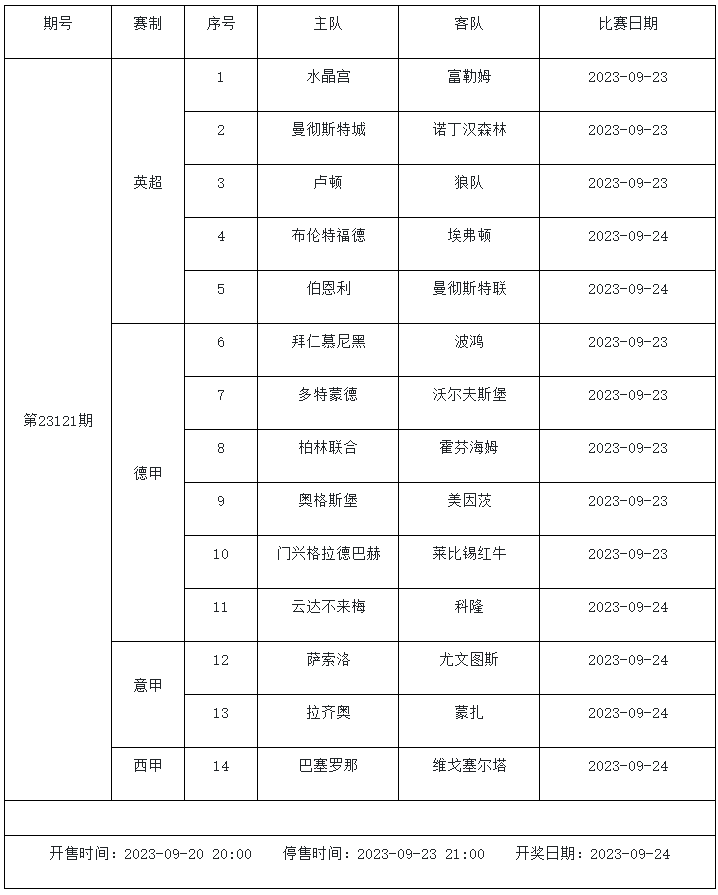 传统足彩第23121期的赛事主要由英超、德甲、意甲和西甲组成。五大联赛激战正酣,豪门球队都参加了周中的欧战,一周双赛对于球队体能有着不小的影响。其中曼城、曼联、拜仁和巴萨等豪门都入选了本期足彩,他们能否全取三分我们一起来分析。