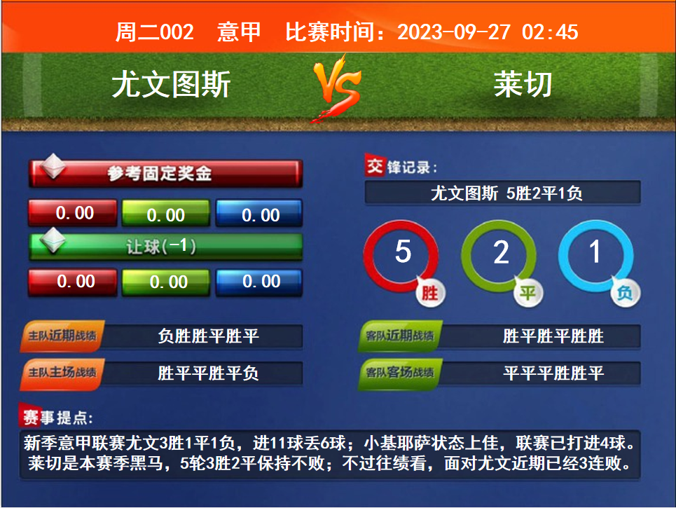 比赛时间:2023-09-27 02:45赛事提点:新季意甲联赛尤文3胜1平1负,进11球丢6球;小基耶萨状态上佳,联赛已打进4球。莱切是本赛季黑马,5轮3胜2平保持不败;不过往绩看,面对尤文近期已经3连败。