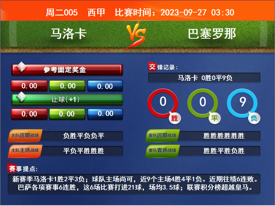 比赛时间:2023-09-27 03:30赛事提点:新赛季马洛卡1胜2平3负;球队主场尚可,近9个主场4胜4平1负。近期往绩6连败。巴萨各项赛事6连胜,这6场比赛打进21球,场均3.5球;联赛积分榜超越皇马。