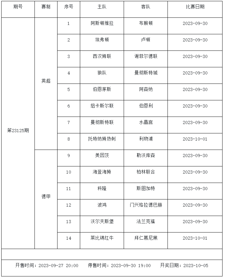 莱比锡周中德国杯3:2击败韦恩,各项赛事取得6连胜,出色的防守能力是莱比锡在今夏大失血之后依旧能保持竞争力的关键。在德甲赛季初的5场比赛里莱比锡打进14球仅失4球,是目前德甲失球最少的球队之一,以亨利西斯+西马坎+卢科巴+劳姆的后防组合功不可没。拜仁上轮联赛7:0血洗波鸿,凯恩上演帽子戏法,目前打进7球排在德甲射手榜第2的位置。目前队内主力前腰穆西亚拉因伤无法出战,舒波莫廷替代他的位置,和科曼、萨内以及凯恩梳理球队攻击线,球队的替补席上还有穆勒、格雷茨卡和格拉布里等众多进攻好手,球队主帅图赫尔能够打出的牌还有不少。两支球队在本赛季初的德国超级杯中有过交手,当时拜仁以0:3的比分不敌莱比锡,当时凯恩还未加入球队,并非最强阵容出战,经历了多场比赛的磨合之后,拜仁有信心能够复仇对手全身而退。足球彩票胜负游戏(14场和任选9场)第23125期赛程: