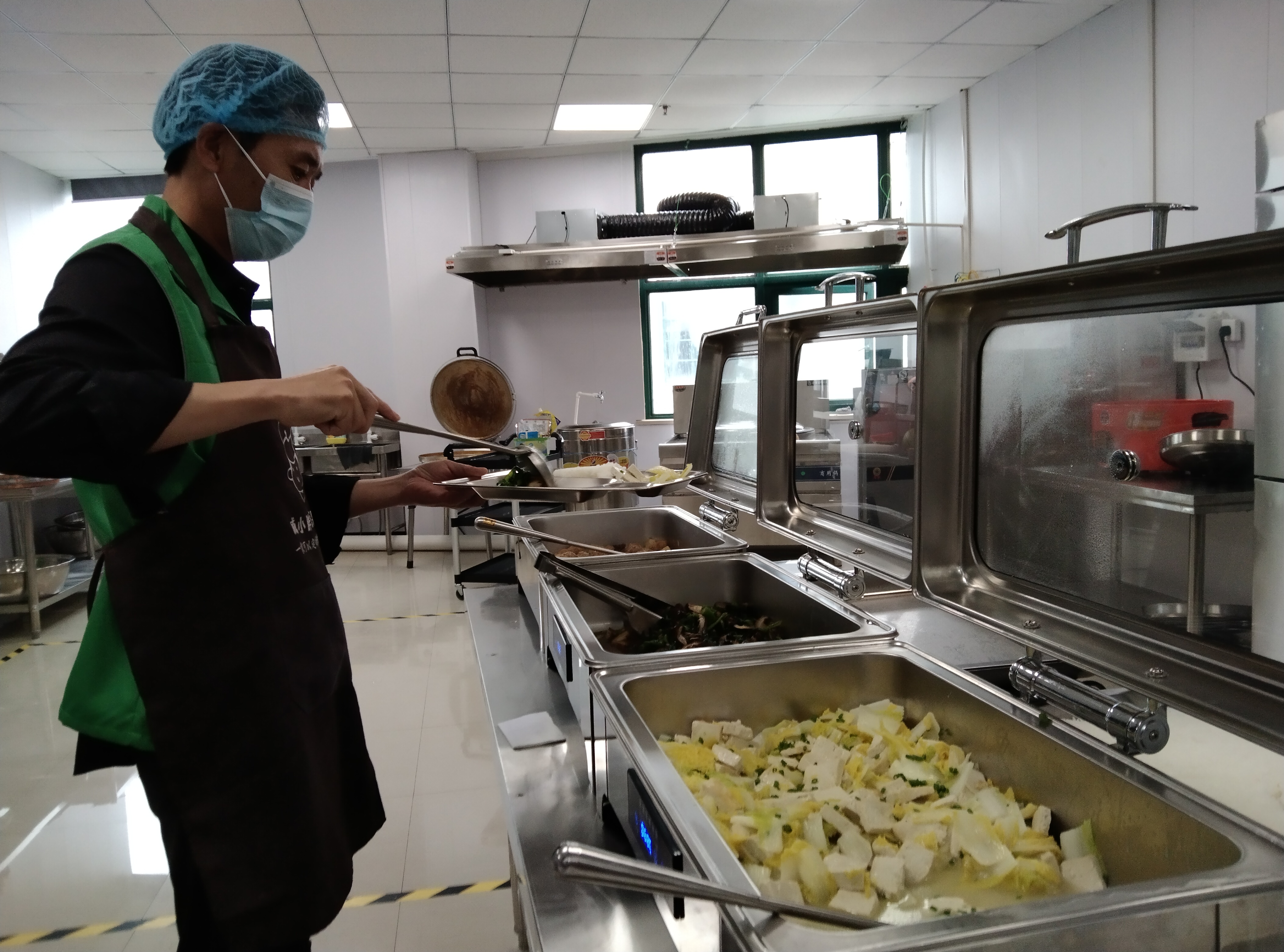 时针旋转,临近中午,养老服务中心餐厅飘出了阵阵饭香,身着厨师服的工作人员有序为老人供餐。