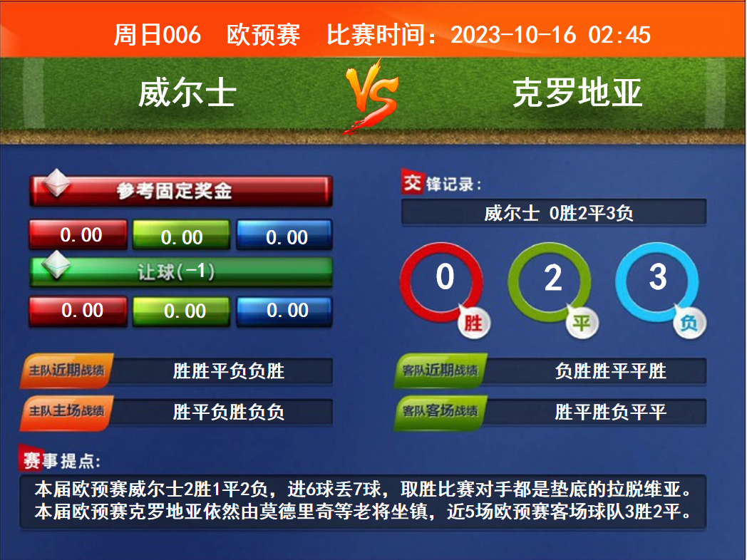 比赛时间:2023-10-16 02:45赛事提点:本届欧预赛威尔士2胜1平2负,进6球丢7球,取胜比赛对手都是垫底的拉脱维亚。本届欧预赛克罗地亚依然由莫德里奇等老将坐镇,近5场欧预赛客场球队3胜2平。