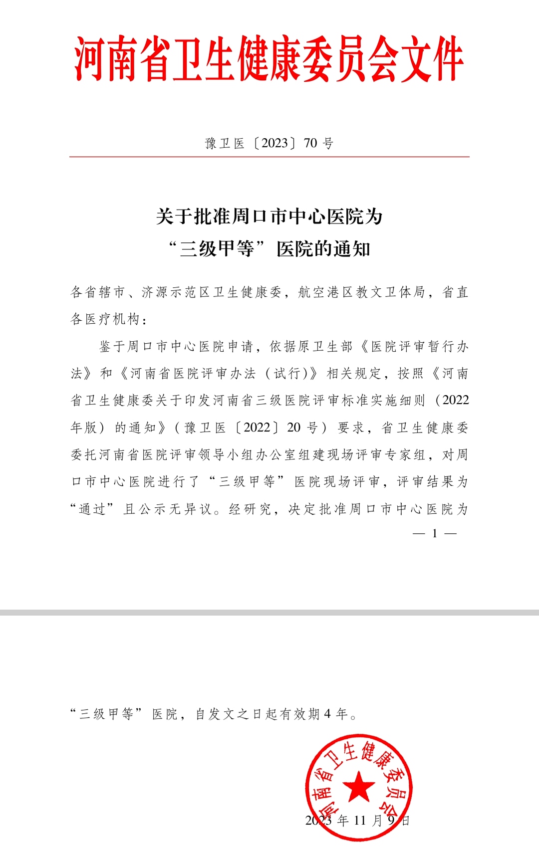 11月9日,河南省卫生健康委员会正式发文,经过资格审查、数据填报、现场评审、综合评分、结果公示,批准市中心医院正式通过国家三级甲等医院复审,标志着市中心医院发展实现新突破,迈上新高度。 自去年7月份,市中心医院启动了“三级甲等”医院复审工作,周口市委、市政府高度重视复审工作,市卫健委多次督导,并协调相关部门予以全力支持。市中心医院成立领导组和三甲办,全院职工迅速进入“三级甲等”复审战时状态,按照《河南省“三级甲等”医院评审标准实施细则》要求,逐项对照落实,责任到科到人,高标准严要求,常督导、常考核、常通报。同时,医院按照创建标准,不断加强硬件设施、重点学科和医院文化建设,进一步规范医疗质量管理,着力提升优质便民服务,使医院在技术水平、服务质量、信息化建设、综合管理等方面均跨上了一个新台阶。