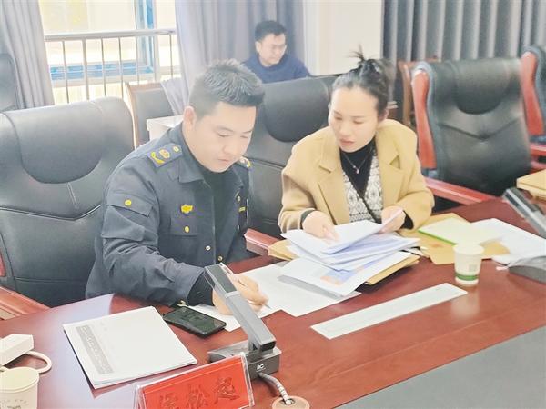核查组工作人员(右)与太康县应急管理局工作人员核查相关数据。