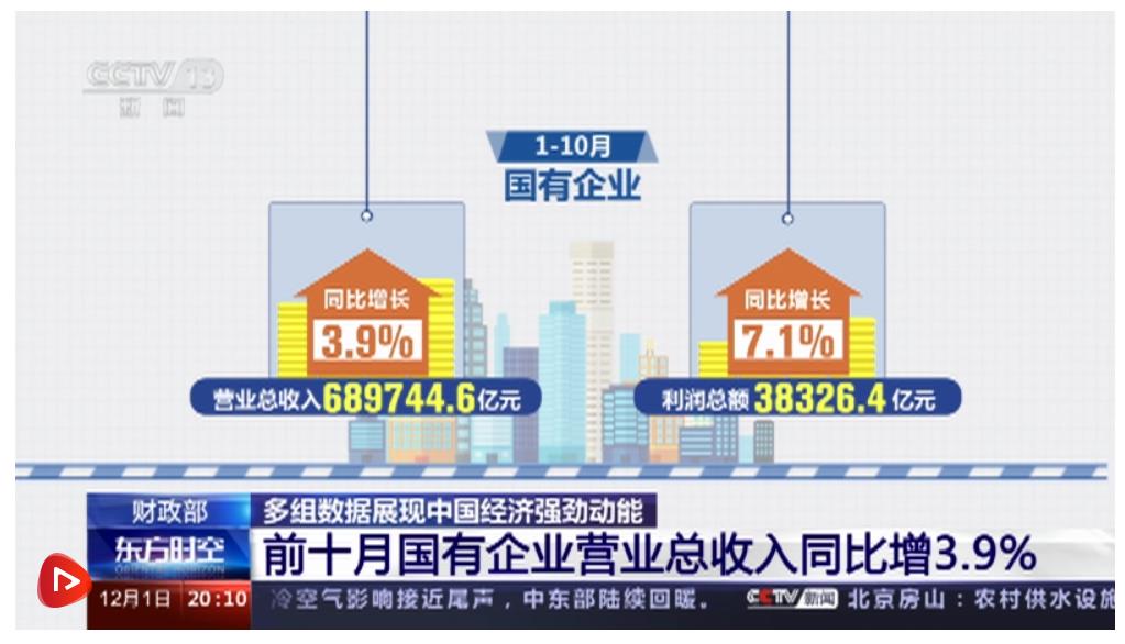 财政部11月30日发布今年前10月全国国有企业经济运行情况。数据显示,1—10月,国有企业营业总收入689744.6亿元,同比增长3.9%;利润总额38326.4亿元,同比增长7.1%。国有企业生产经营持续稳定恢复,叠加去年同期低基数因素影响,主要效益指标呈现较快增长。