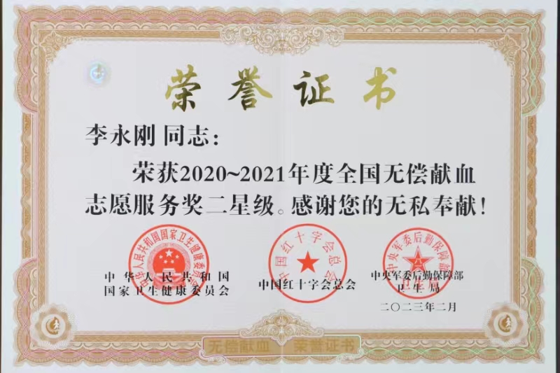 无偿献血传爱心,志愿服务践使命。近日,周口市公安局留置看护支队支队长李永刚获得由国家卫生健康委员会、中国红十字会总会、中央军委后勤保障部卫生局联名颁发的“无偿献血志愿服务奖二星级”荣誉,表彰李永刚在2020年至2021年度对全国无偿献血事业做出的突出贡献。