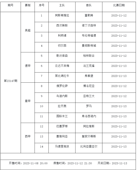 足球彩票胜负游戏(14场和任选9场)第23147期赛程: