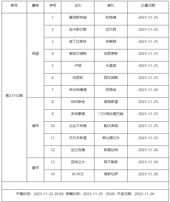 足球彩票胜负游戏(14场和任选9场)第23152期赛程: