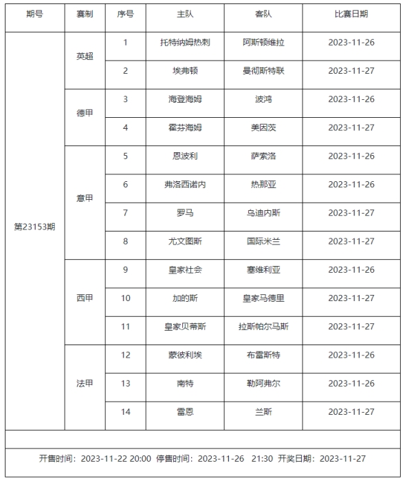 足球彩票胜负游戏(14场和任选9场)第23153期赛程:
