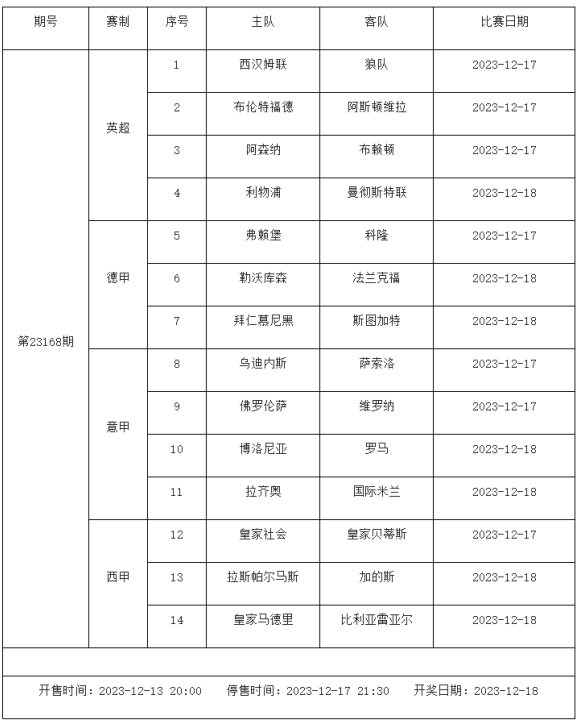 足球彩票胜负游戏(14场和任选9场)第23168期: