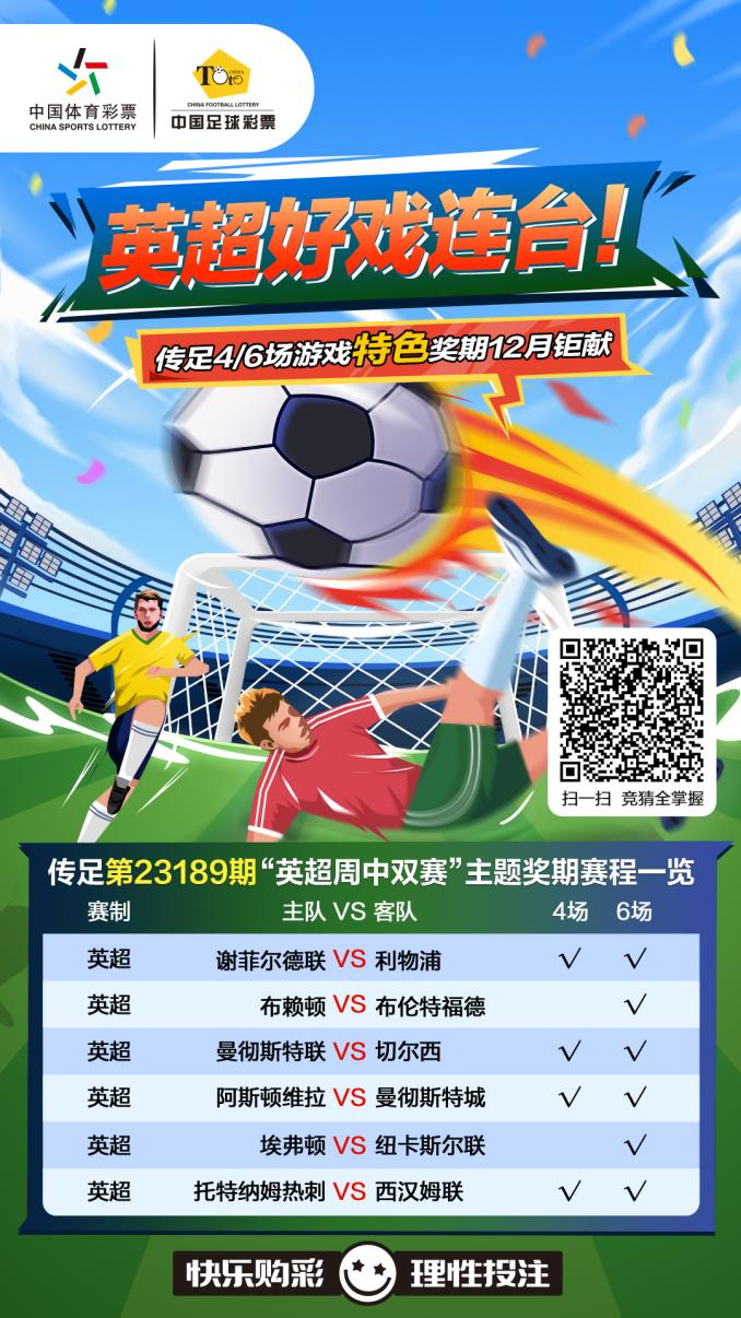 第23189期传足特色奖期已经于12月3日20:00开售,将于12月6日22:00停售,并于12月8日开奖。其中谢菲尔德联VS利物浦、曼联VS切尔西、阿斯顿维拉VS曼城和热刺VS西汉姆联为4场进球游戏竞猜赛事。