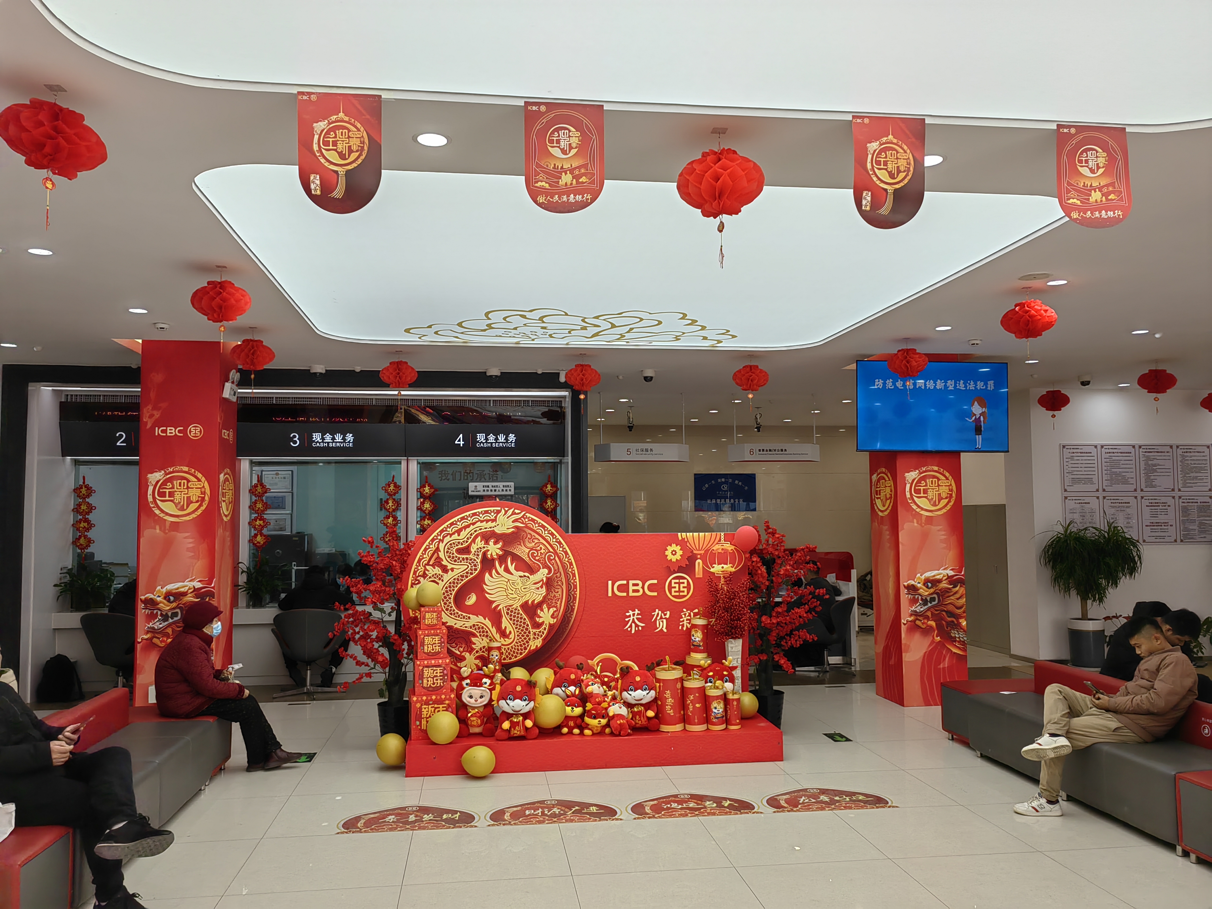 该行结合各网点物理环境特点,提前布局,抓实细节,出台网点迎“双节”装饰方案,一行一方案,在各网点厅堂显著区域设置新春吉祥文化台,重点摆放龙年吉祥物、礼盒彩球、吉祥展板和吉祥树等,门窗福字贴画、电视大屏新春祝福、吊顶红灯笼等中国新春元素。志愿服务站医药箱、花镜、轮椅等便民设施一应俱全,网点绿植美化鲜艳,厅堂工作人员服务热情周到,整个营业大厅洋溢着吉祥和谐、喜庆红火的年味儿!