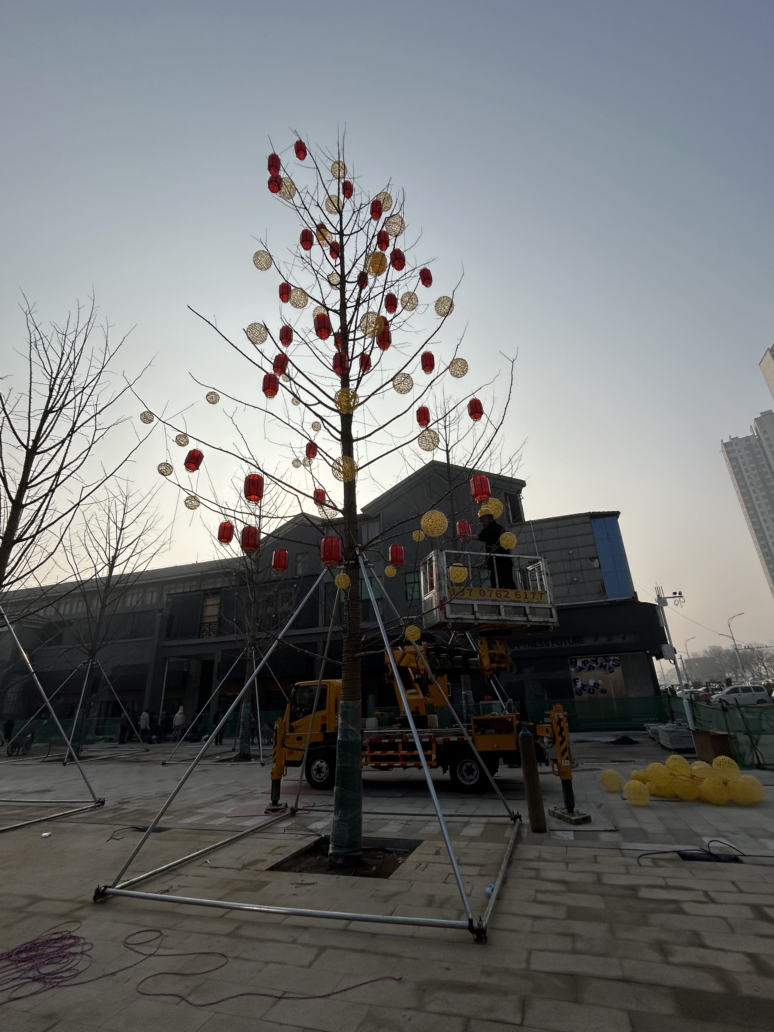 工作人员正在用灯笼装饰街区。