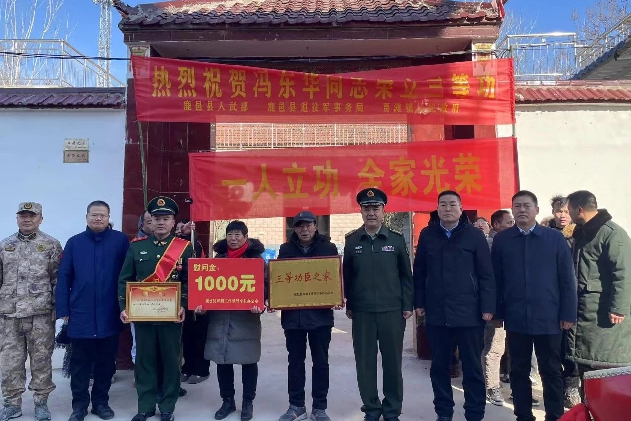 喜报传佳音,荣耀满门庭。为进一步弘扬新时代拥军优属光荣传统,增强军人荣誉感和军属自豪感,1月22日,鹿邑县人武部领导带领县人武部、县退役军人事务局及贾滩镇党委政府相关负责同志及现役军人所在部队代表一行人,敲锣打鼓来到荣立三等功的现役军人冯东华同志家中,送上立功喜报和慰问品,向立功军人及家属表达亲切的关怀和衷心的祝贺。