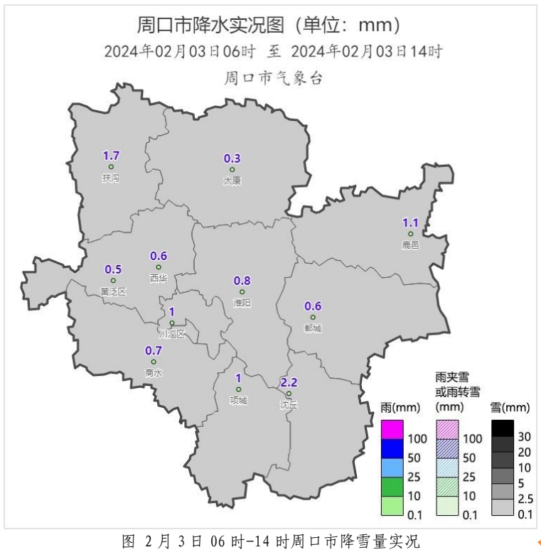 过程累计雨雪量:1月31日14时﹣2月3日14时,最大雨雪量出现在扶沟17.4 毫米。各国家站累计雨雪量(毫米):扶沟17.4、沈丘16.8、川汇区15.3、商水14.1、项城13.3、郸城13.1、西华12.7、太康12.6、淮阳12.3、鹿邑10.5、黄泛区10.0。