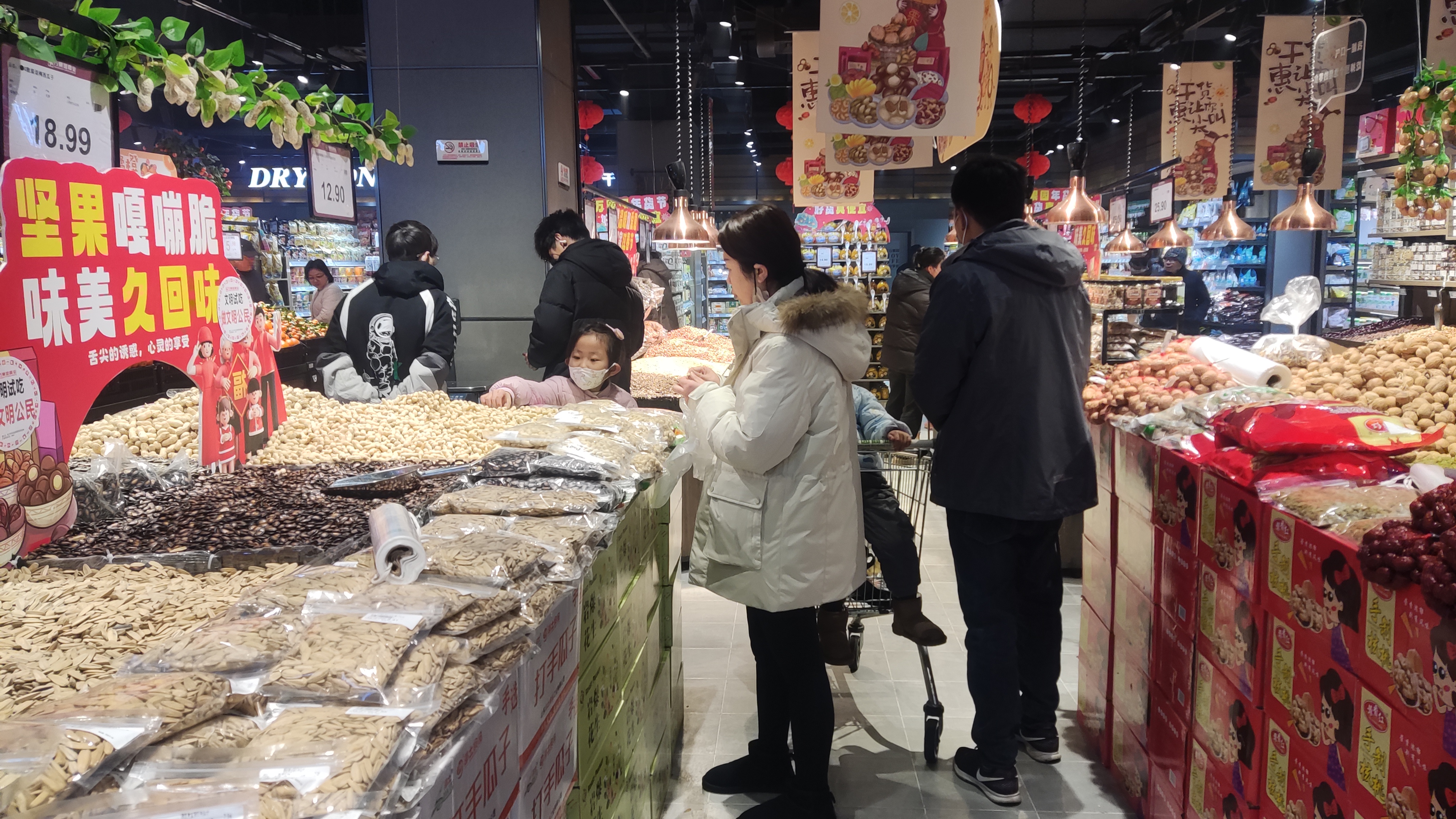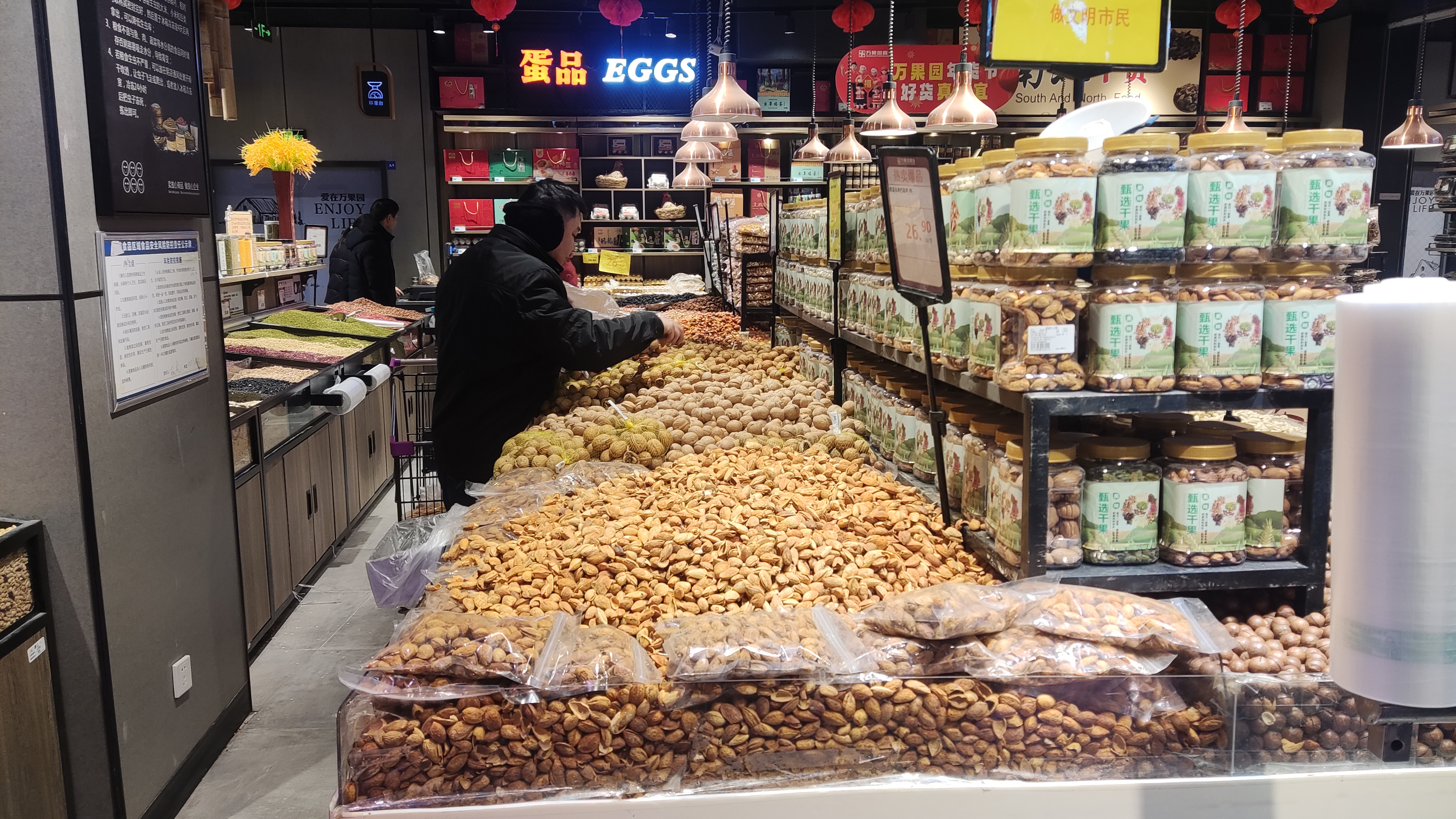 核桃、巴旦木、夏威夷果、碧根果……市民陈女士拎着一大包商品满载而归。“吃坚果健康又养生,家里人都喜欢吃,过年期间一家人边聊天边吃坚果,满满年味。”陈女士说,组合装小袋坚果比较划算,里面有剥好的杏仁、核桃、腰果等,价格不贵,方便实惠。