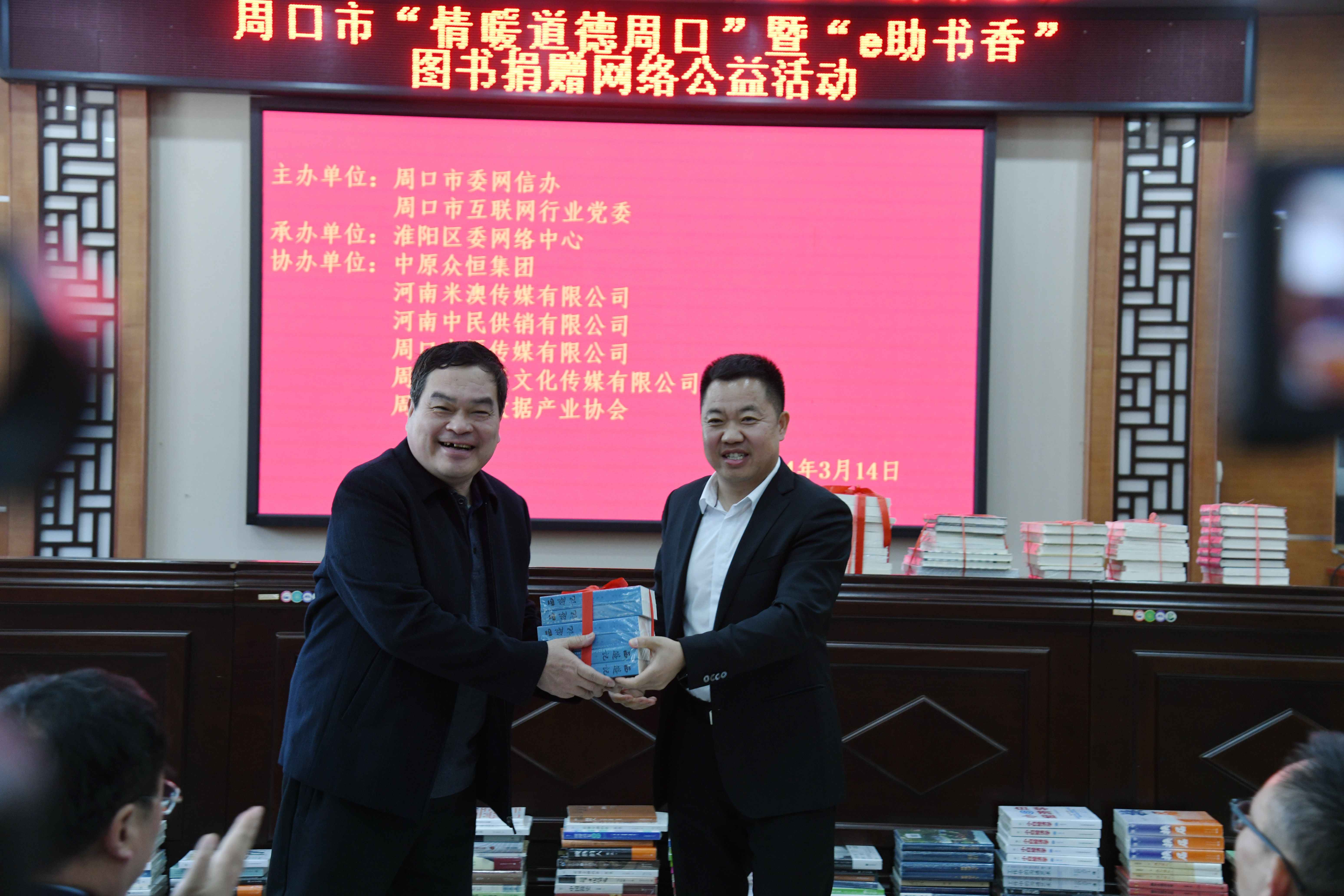 3月11日上午,第二届周口伏羲书展在淮阳开幕。在开幕式的捐赠环节,中原越秀实业有限公司董事长、越秀丰厨(周口)食品科技有限公司董事长李玉平向周口市中小学校捐赠图书300万元码洋(价值300万元约6万册图书)。