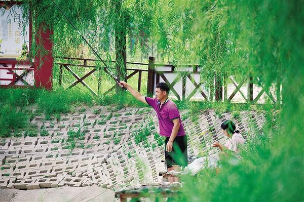 村民在坑塘边垂钓。
