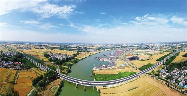 5月27日,周口港中心港区在碧水、蓝天、白云、金色麦浪、秀美村庄的映衬下,显得十分壮美。近年来,我市利用水陆交通优势,加快构建“铁公机水”多式联运体系,努力从“经济通道”迈向“通道经济”。