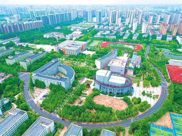 六月二十四日上午,鸟瞰周口师范学院校区,曲折小道环抱音乐厅、大礼堂、图书馆等建筑,宛若一把巨大的琵琶,在中心城区奏响文明发展进行曲。