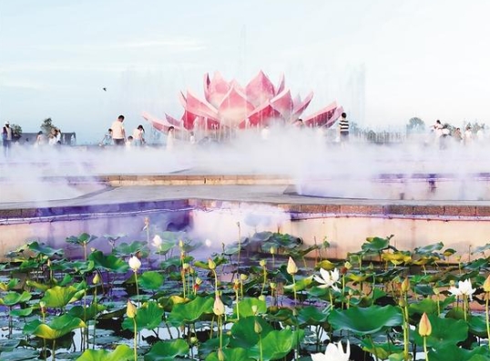 7月3日傍晚,淮阳龙湖荷花苑里,前来乘凉的市民络绎不绝。在一朵粉红色的荷花造型景观周围,喷泉映光影、水雾绕碧荷,如梦如幻,宛如仙境。
