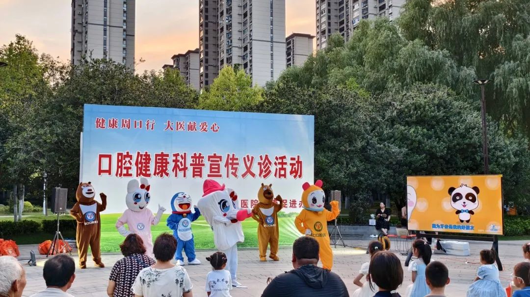 公园的中心广场精心布置有科普宣讲区、义诊咨询区和竞答互动区。灯光屏幕交织,场景氛围浓厚,呈现出一派欢快而有序的景象。随着音乐的响起,一支由周口口腔医院医务人员编排的爱牙舞蹈拉开了活动的序幕。表演团队身着玩偶服,舞姿轻盈,将口腔健康的理念通过舞蹈的形式生动展现,众多市民纷纷驻足观看。