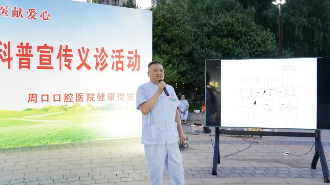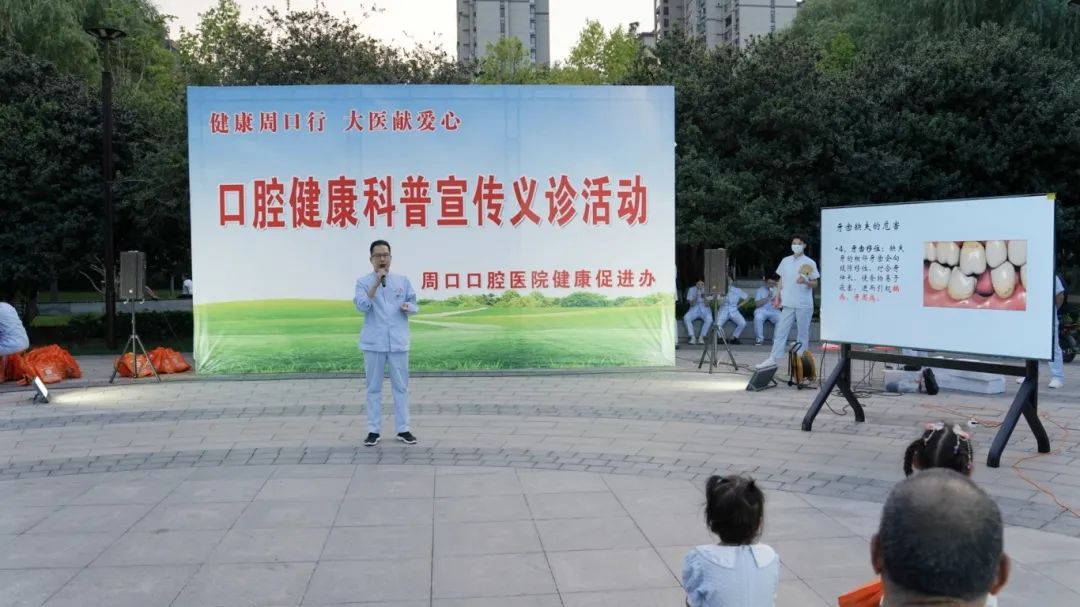 聚光灯下,一方彩色喷绘格外引人注目:“健康周口行 大医献爱心”——口腔健康科普宣传义诊活动,成为当晚公园内最为靓丽的风景。