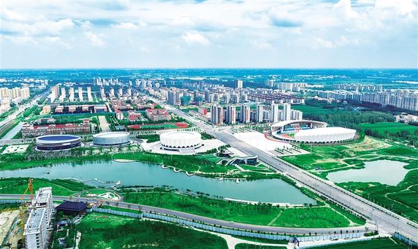 近年来,扶沟县持续优化体育场馆设施,先后规划建成体育场、体育馆、游泳馆等体育健身场所,让体育设施融入城市,不断提升群众幸福指数。图为7月23日,俯瞰扶沟县体育场馆及周边设施。